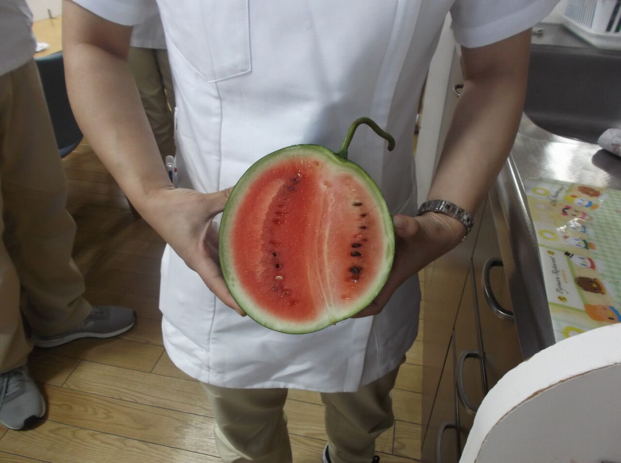 小さなスイカが収穫でき、リハビリ職員で食しました。