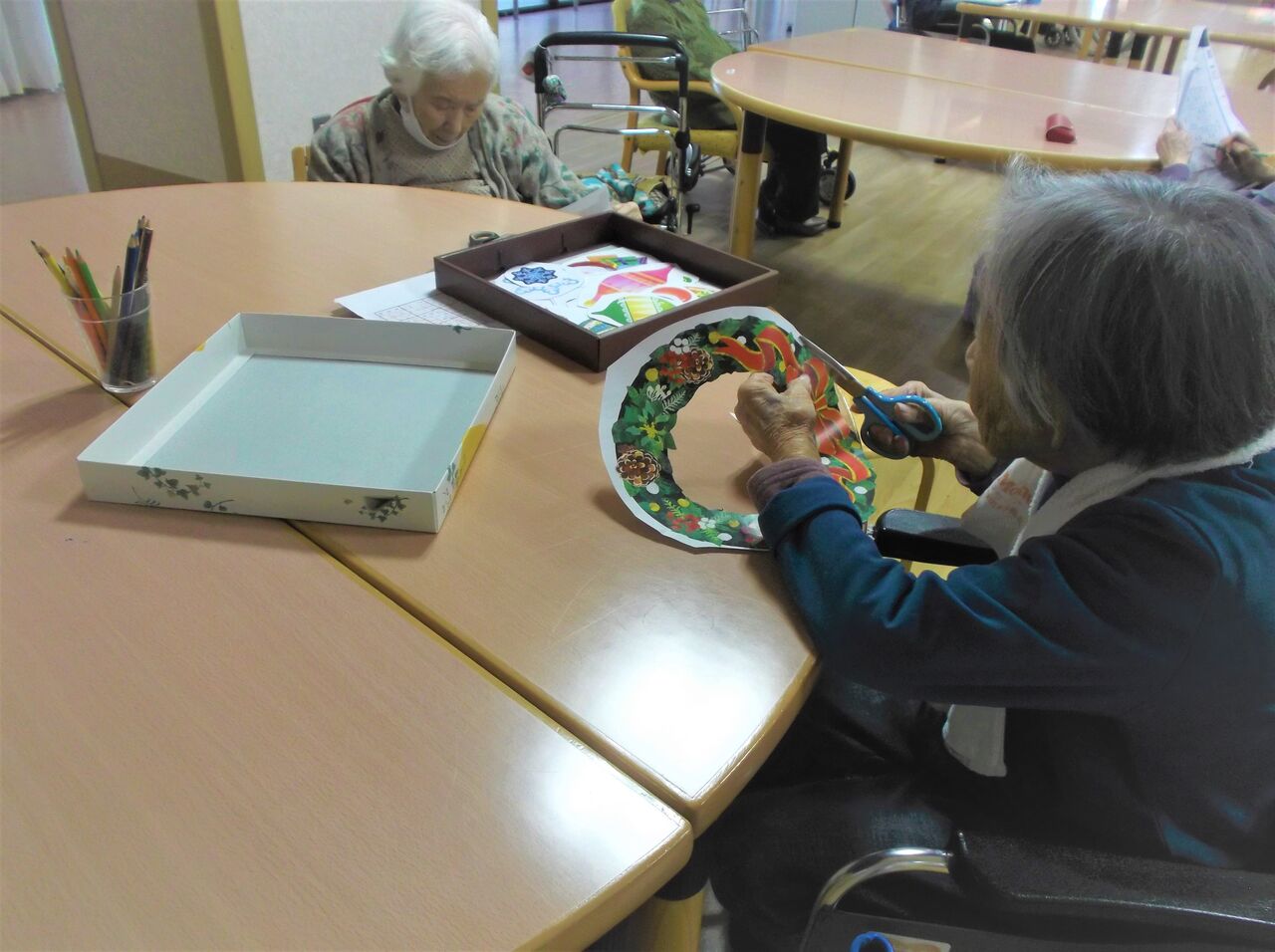 クリスマスのイラストをはさみで切り取って頂きました。皆さん集中して作業されたので、あっという間に完成しました