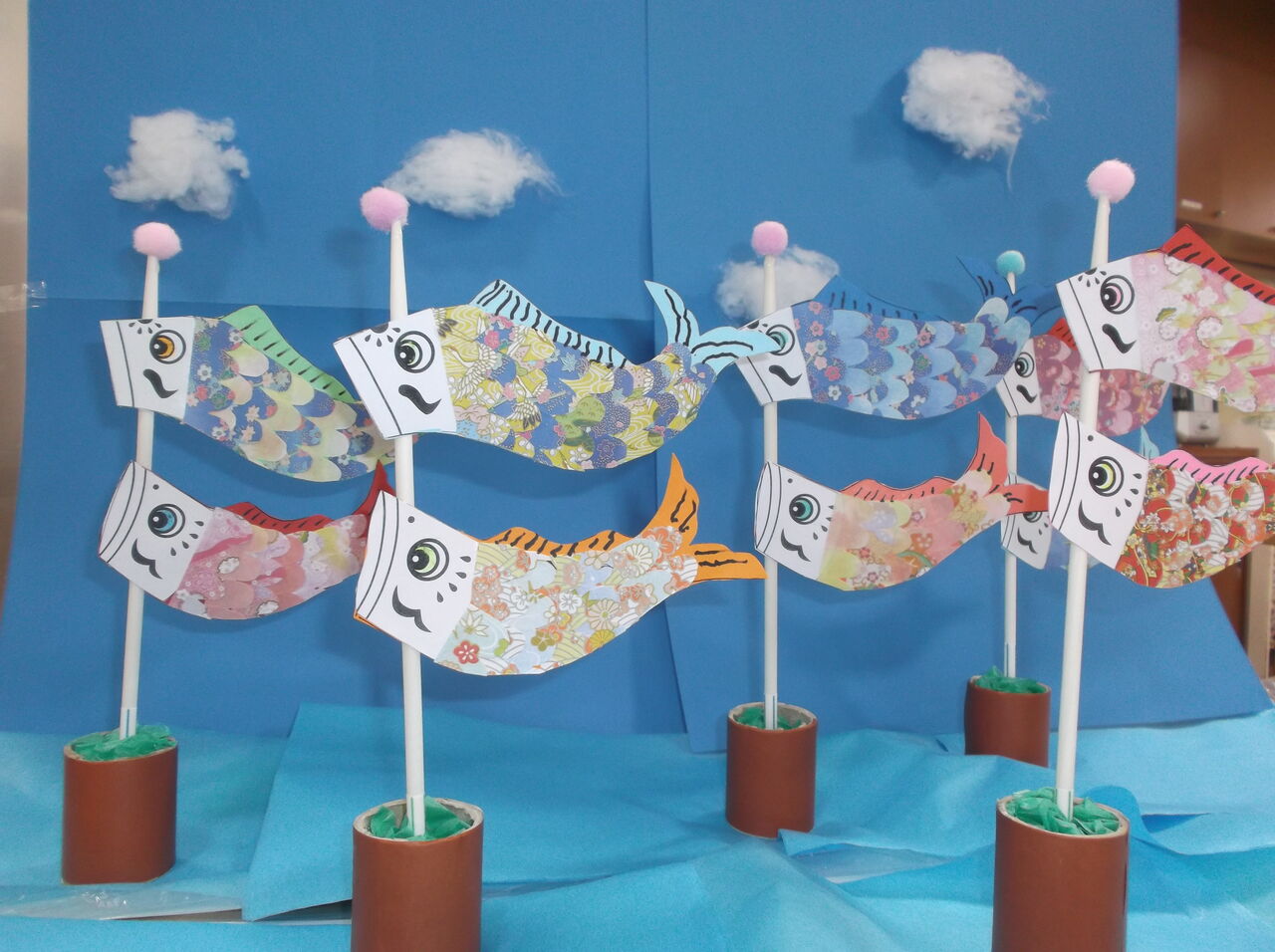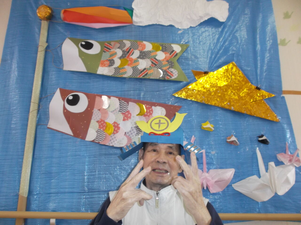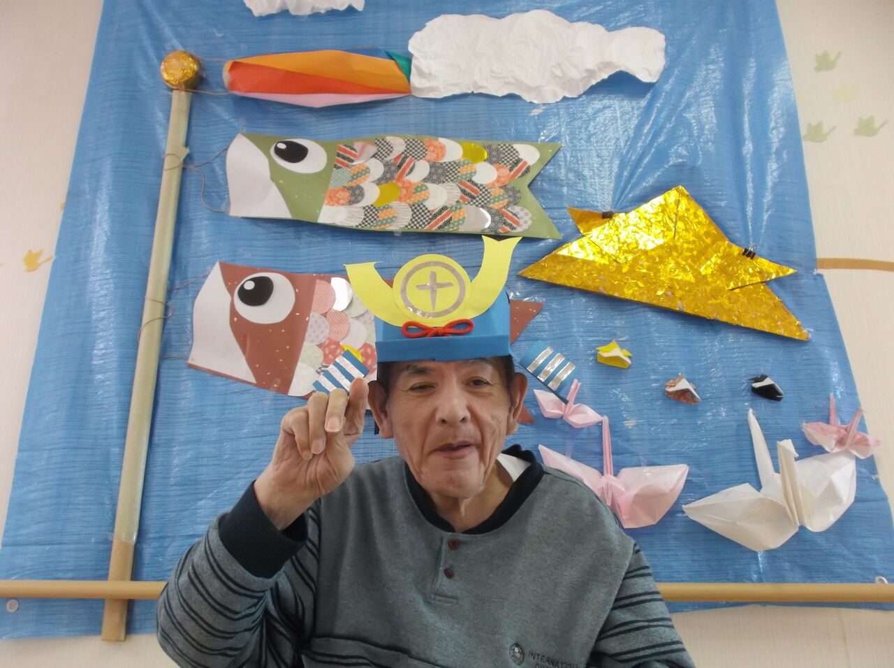 当施設では、端午の節句に合わせてご利用者様と兜や鯉のぼりなどの作品を作りました