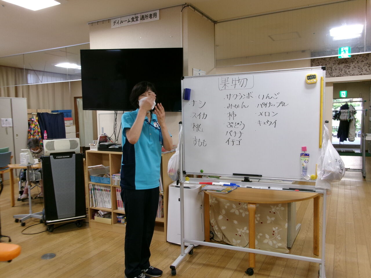 最初は皆さん次々答えますが、10個過ぎるくらいから、なかなか出て来ないものです。そんな時は職員が色や形、時期、食べ方などジェスチャー・ヒントを伝えて、皆さんに答えていただきます。