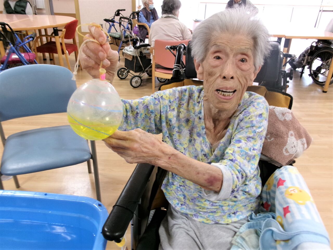 この日のレクリエーションはコップ倒し。棒の先に重りを付けた糸を結び、コップを倒していきます。見た目以上に難しく、白熱しました。