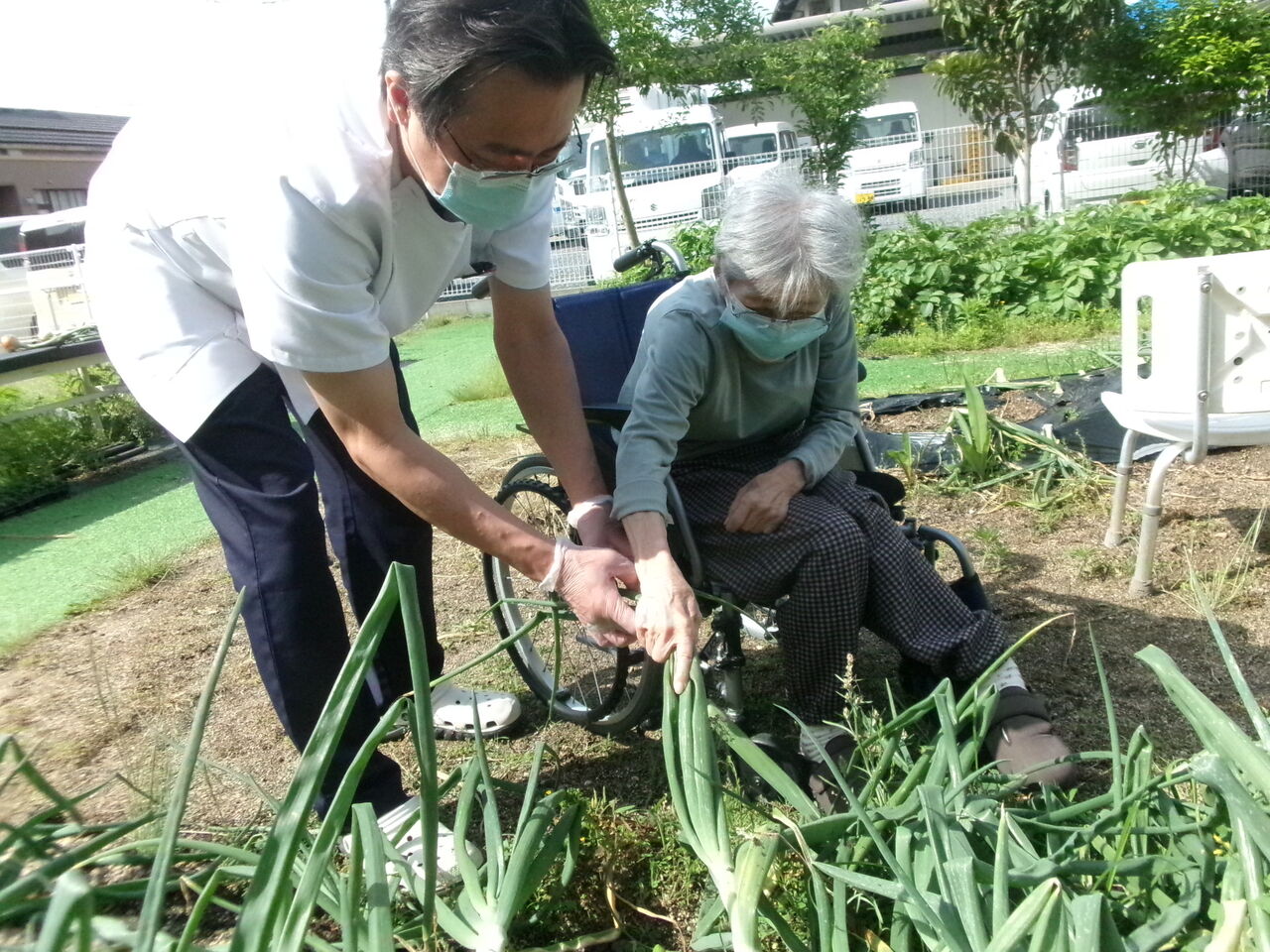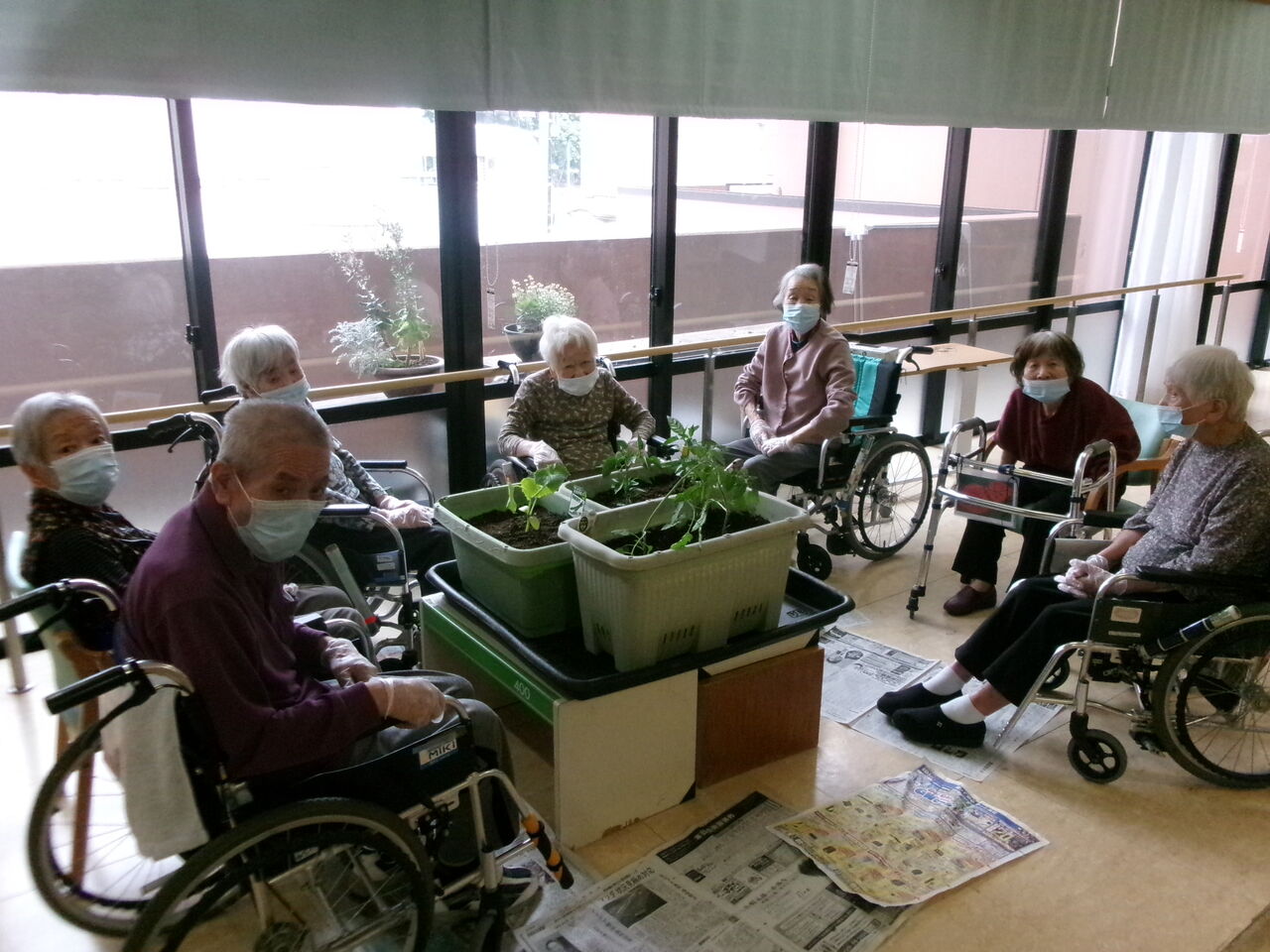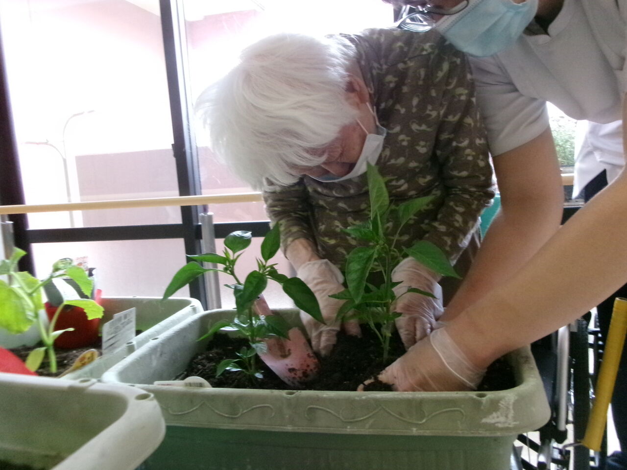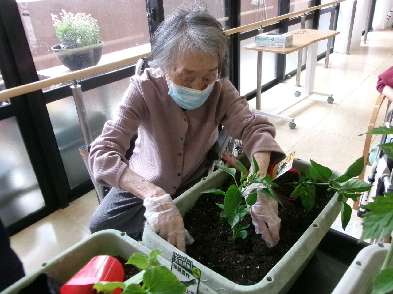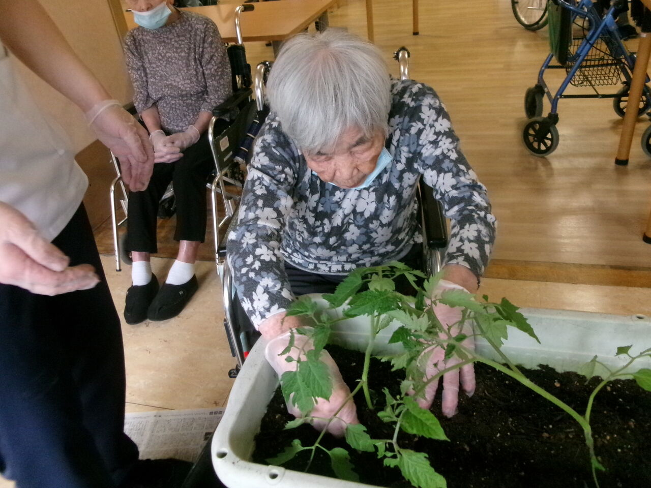利用者様に手伝ってもらい、トマト、ピーマン、キュウリの苗を植えました。