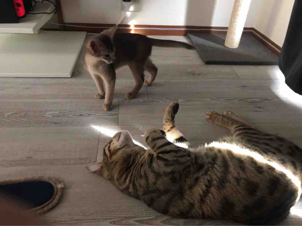 窓辺で日向ぼっこしてたBenelliにJammyがちょっかいをかけだします。