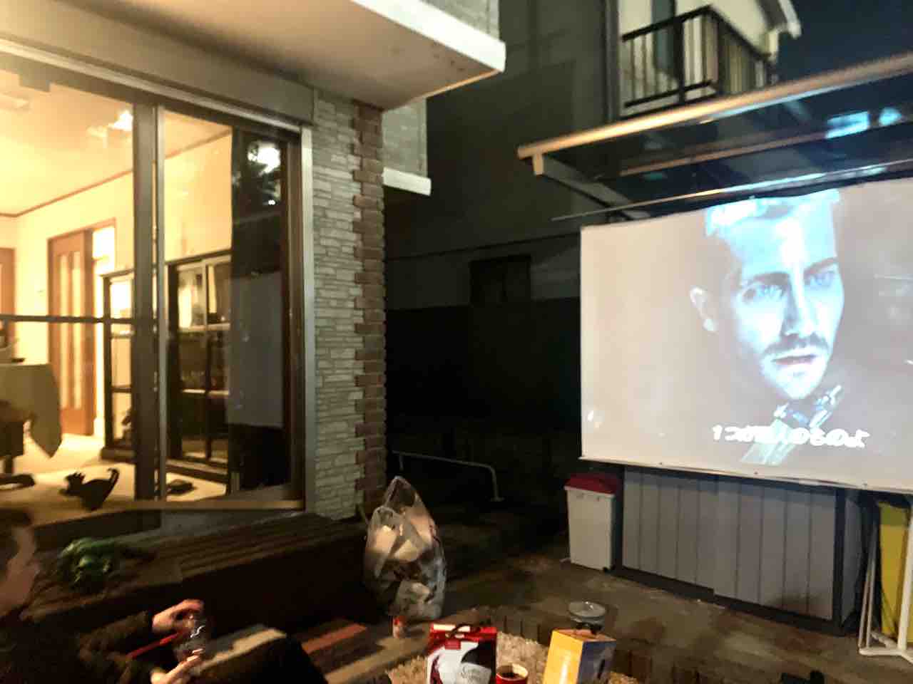 日が暮れてきたので、お庭映画館へチェンジ。