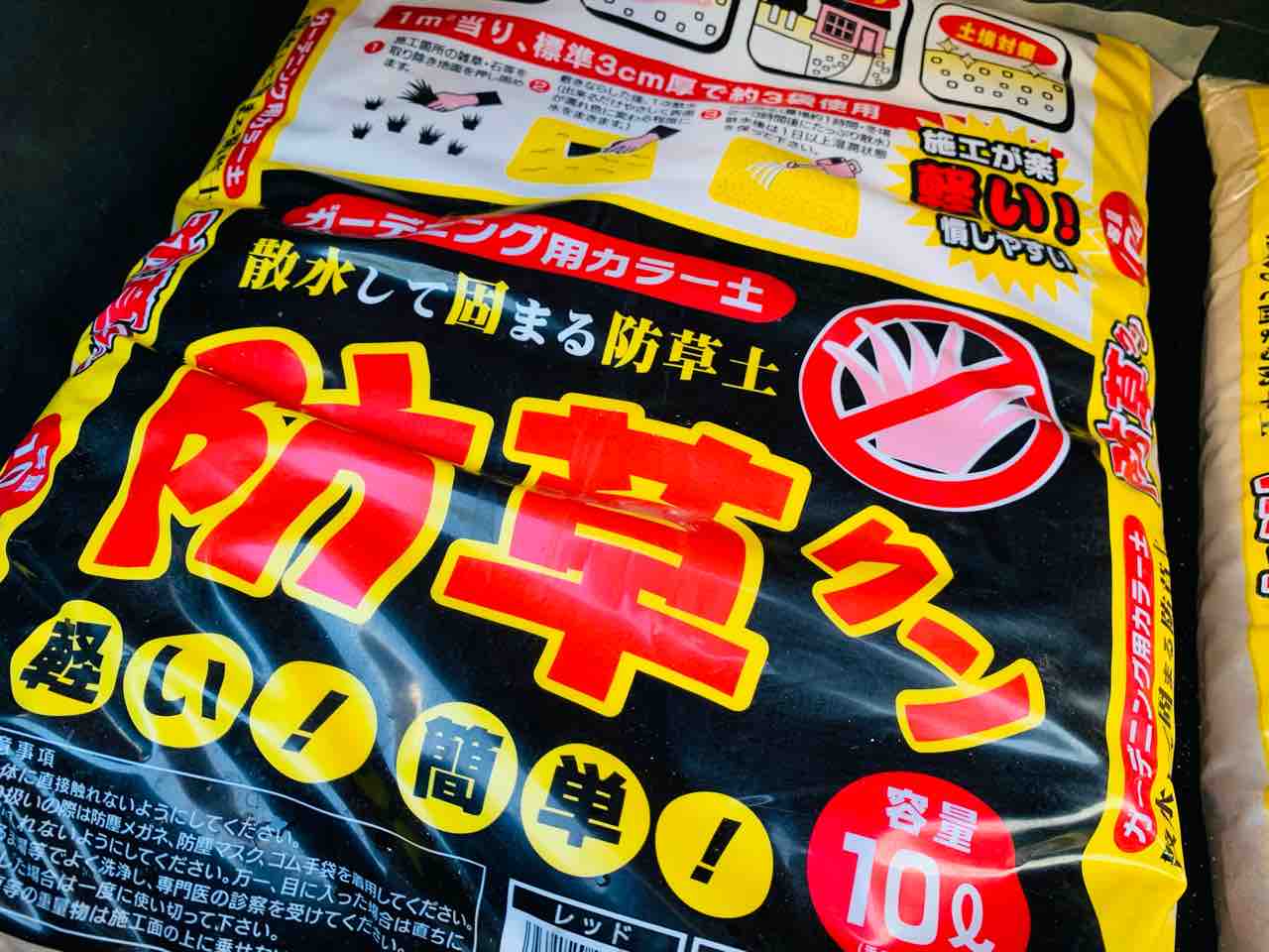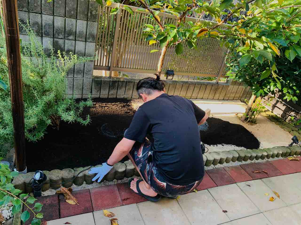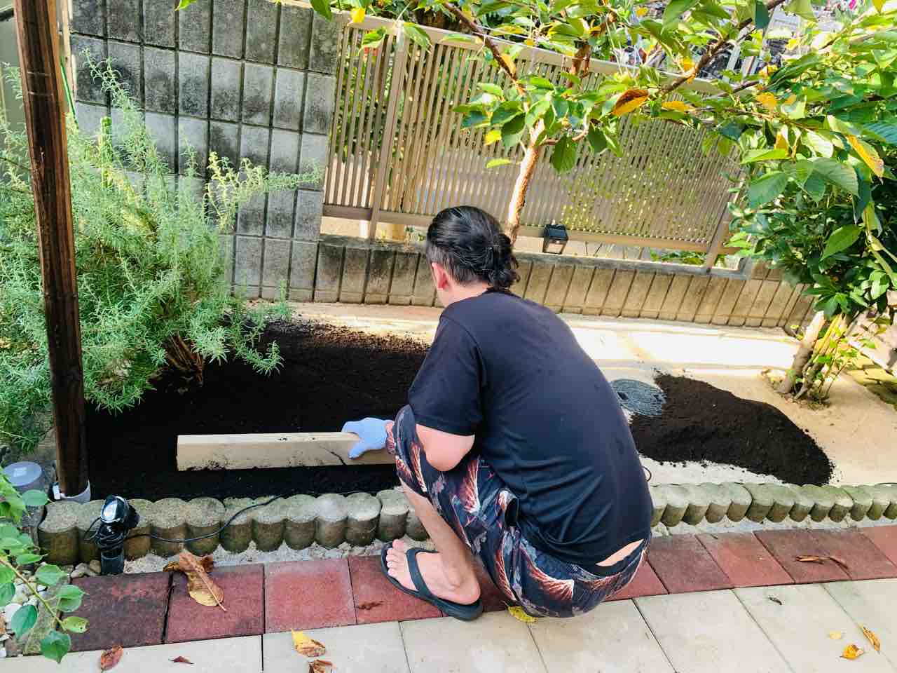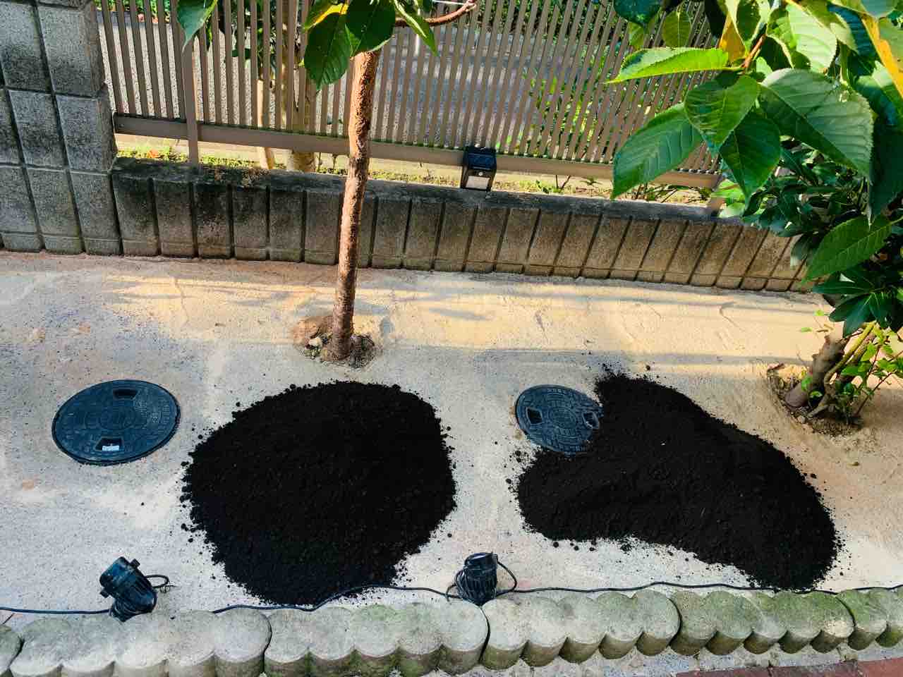 生えていた雑草を抜いた後、固まる土で固めた上から黒土を撒いてます。