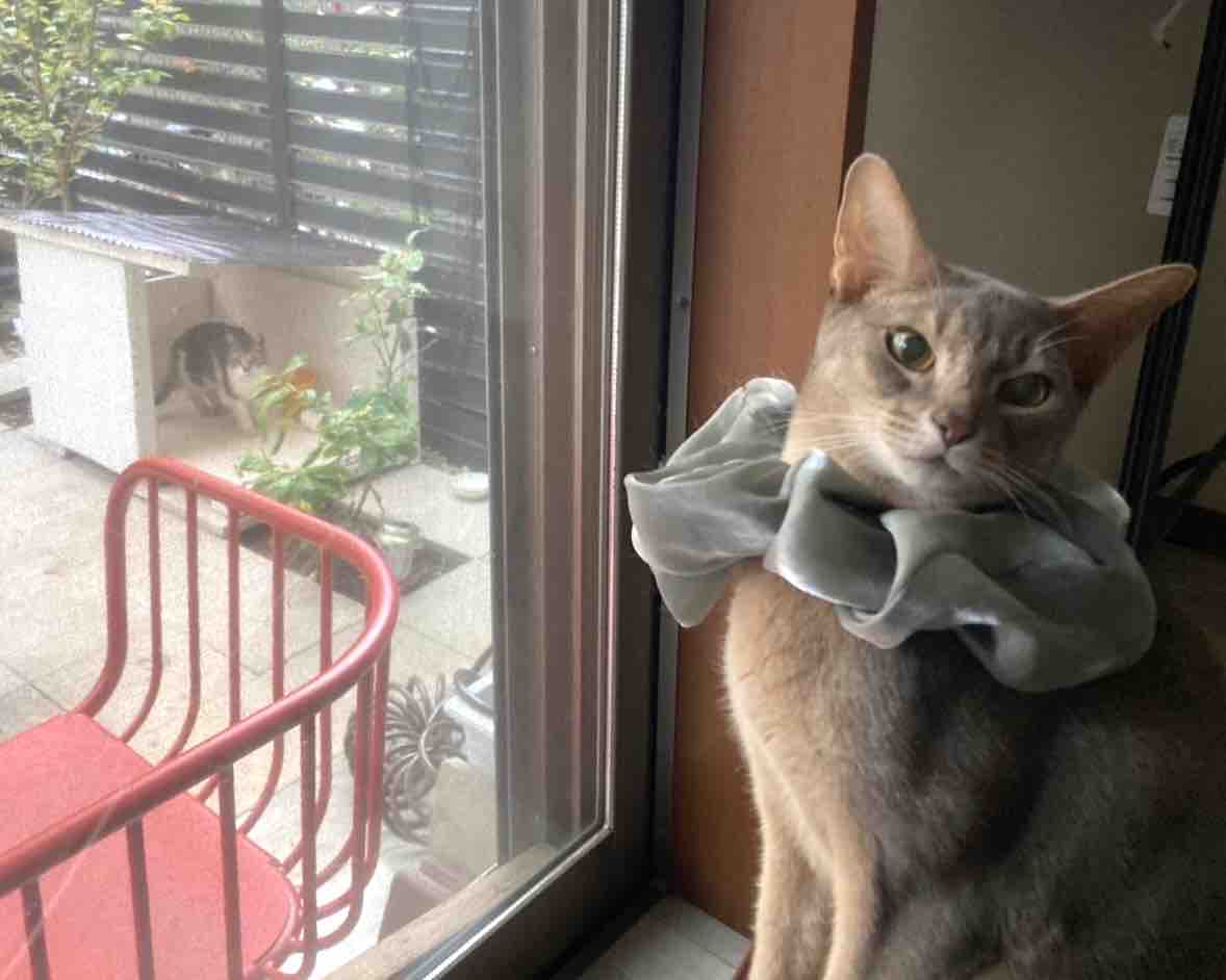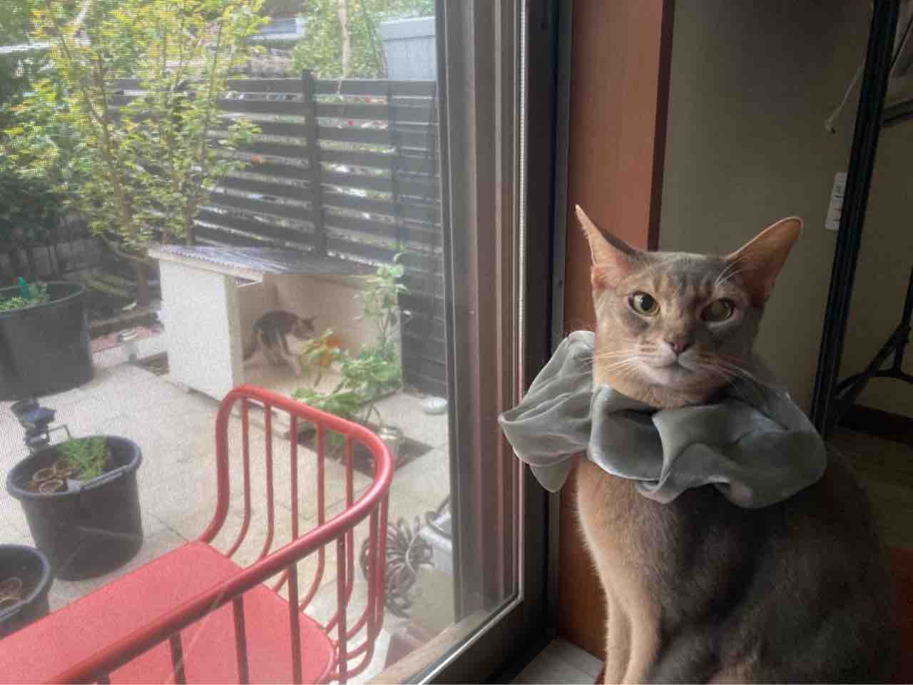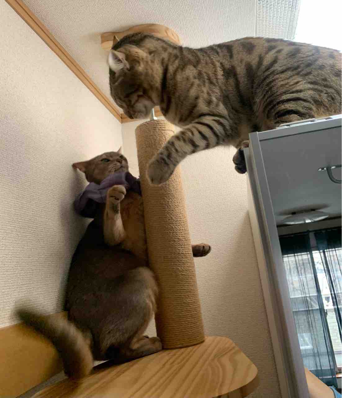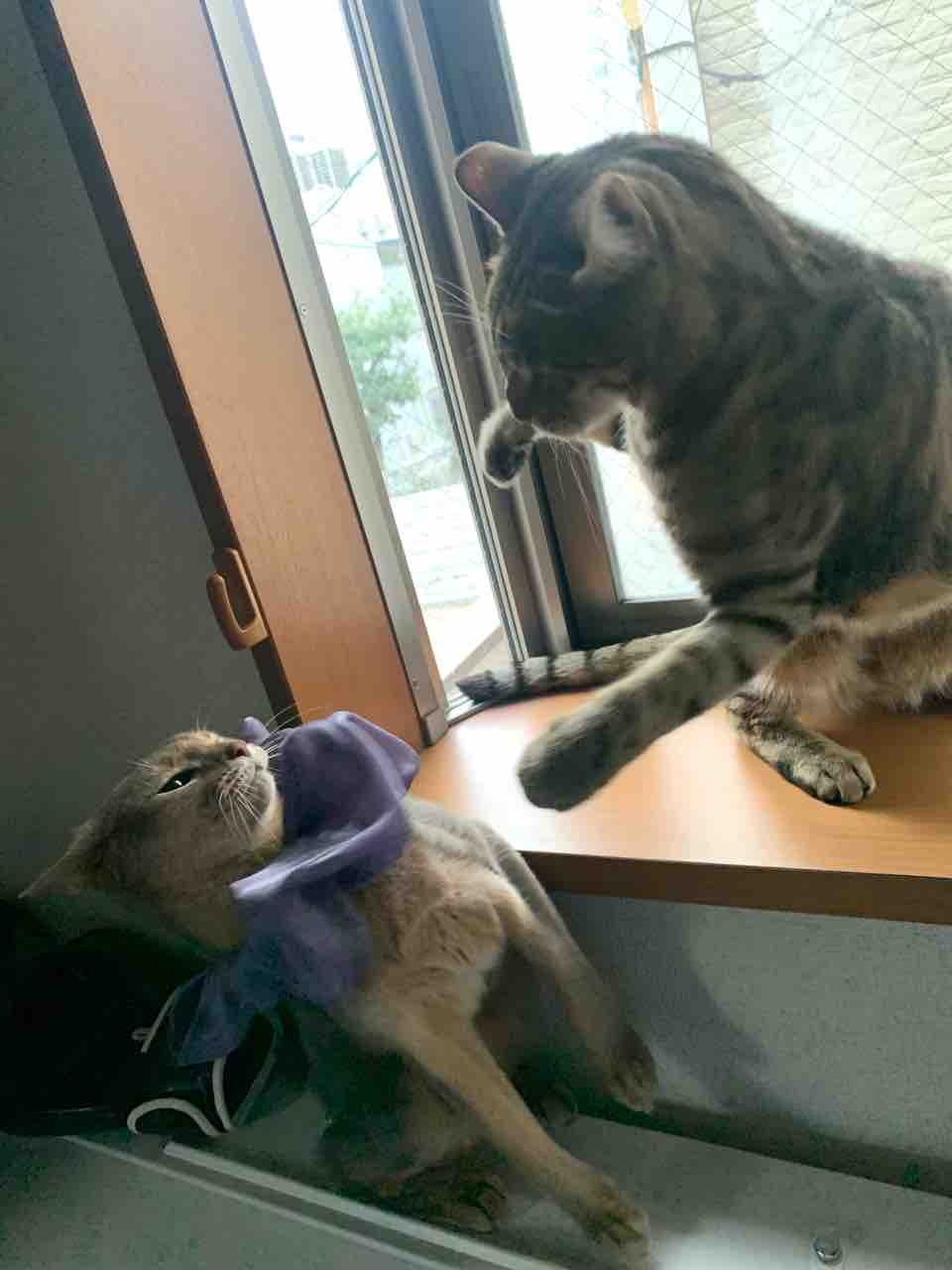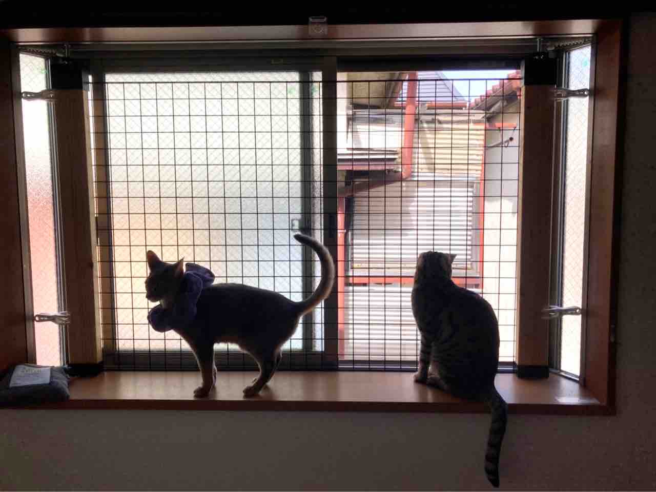 ジャミちゃんがベネリ君を追いかけ回して、出窓に追い詰めてました。