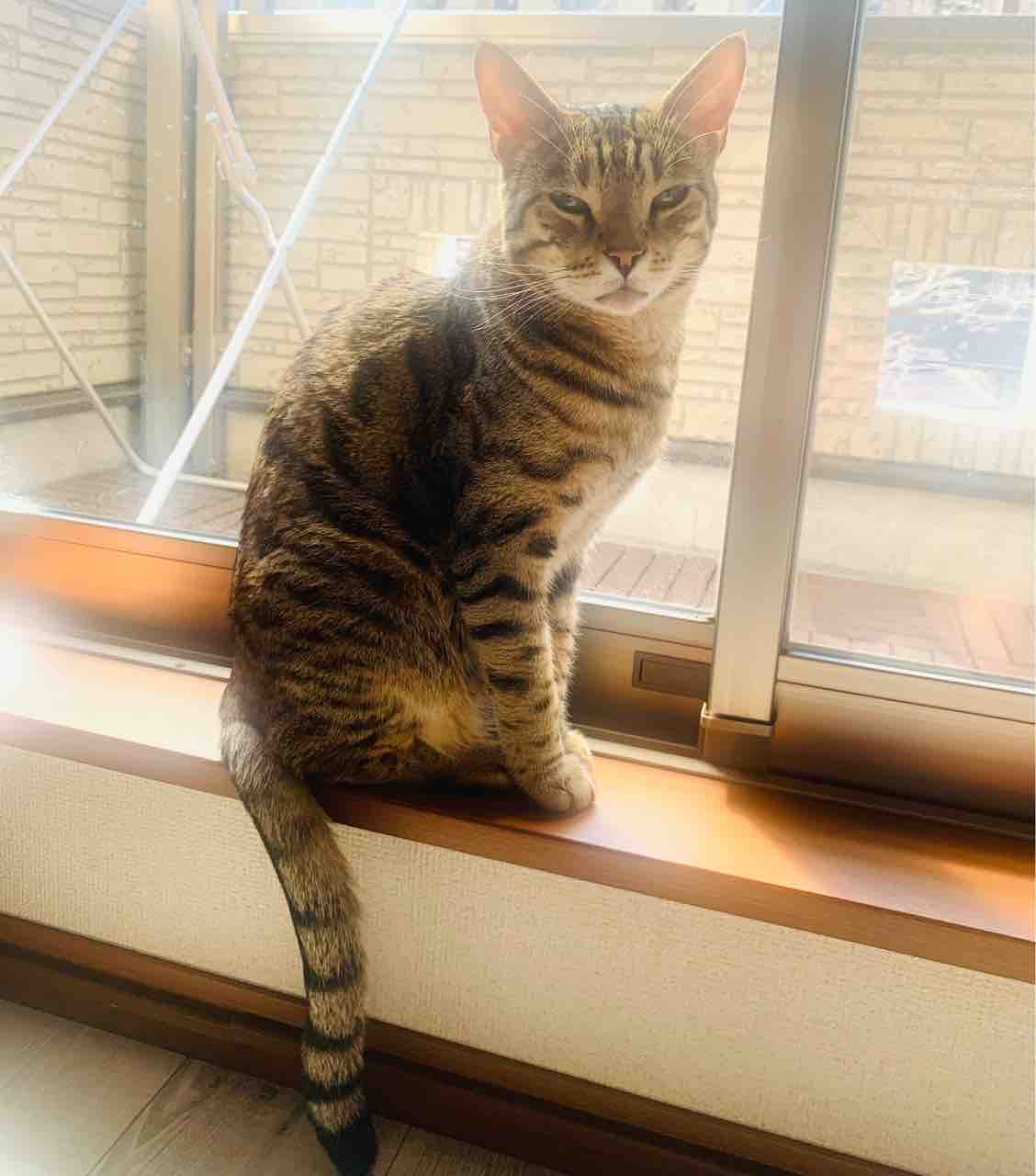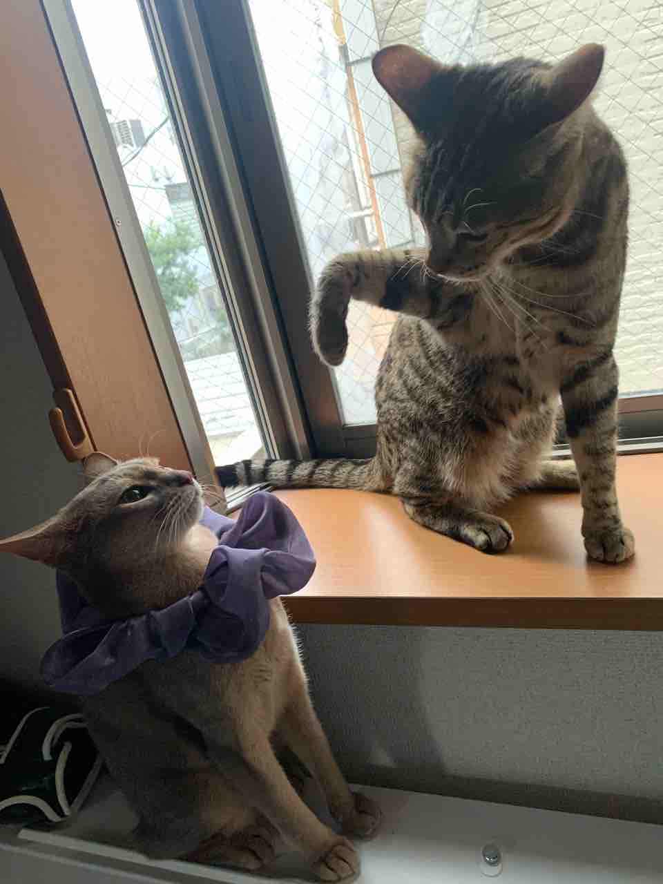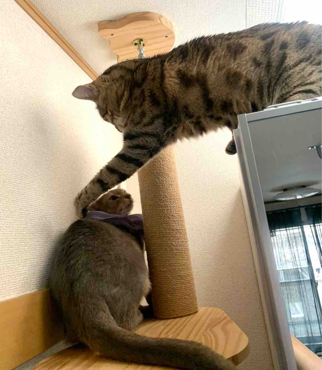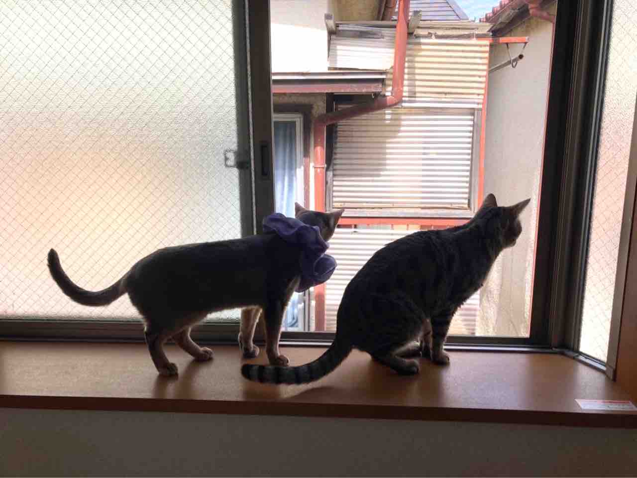 ジャミちゃんがベネリ君を追いかけ回して、出窓に追い詰めてました。