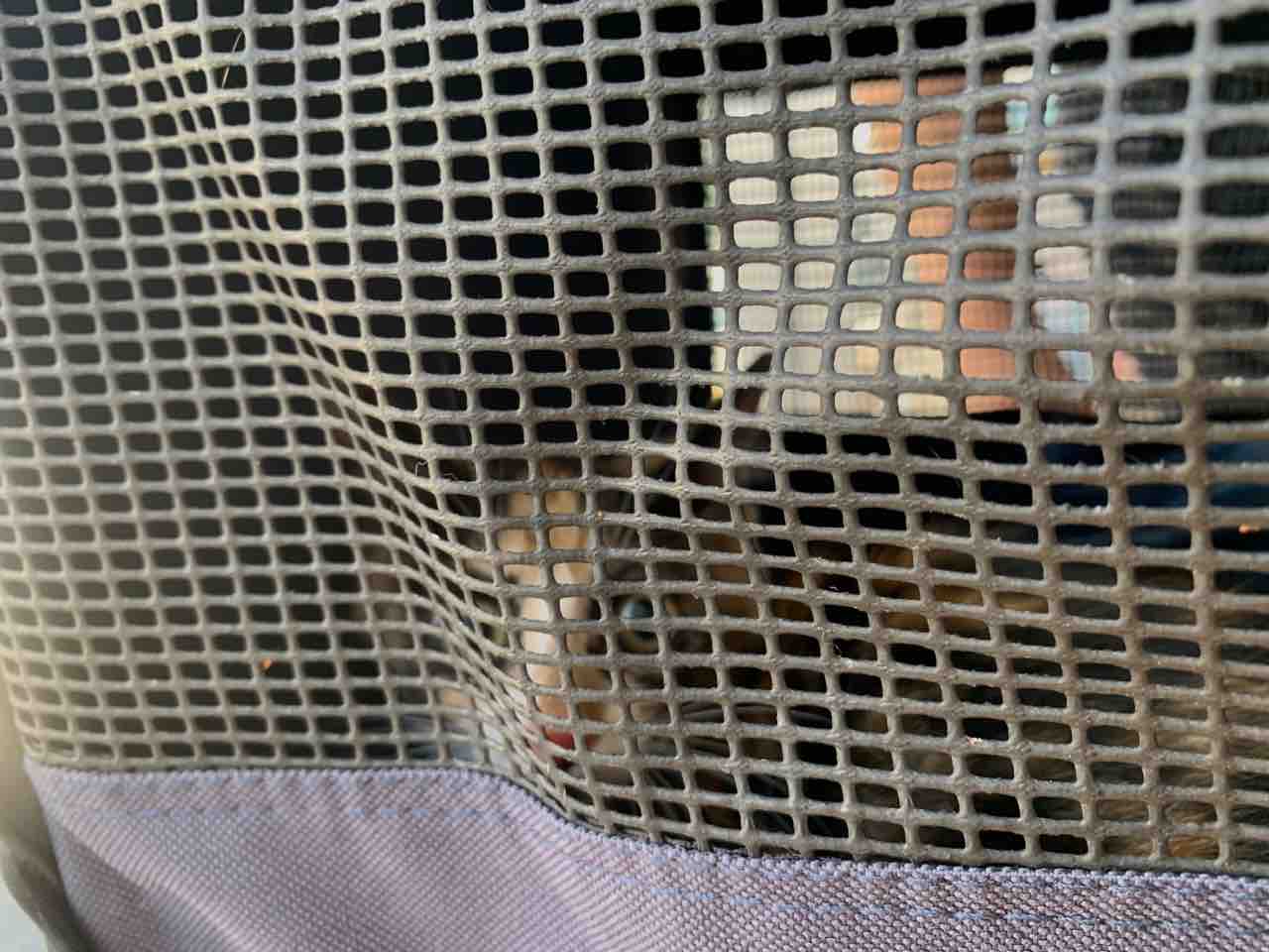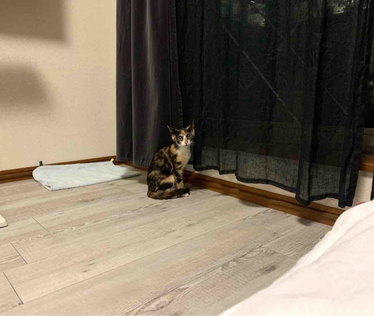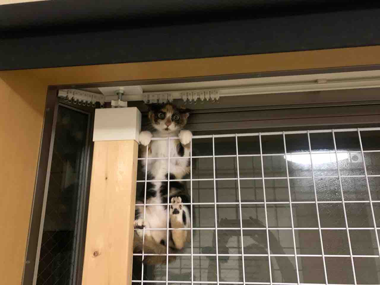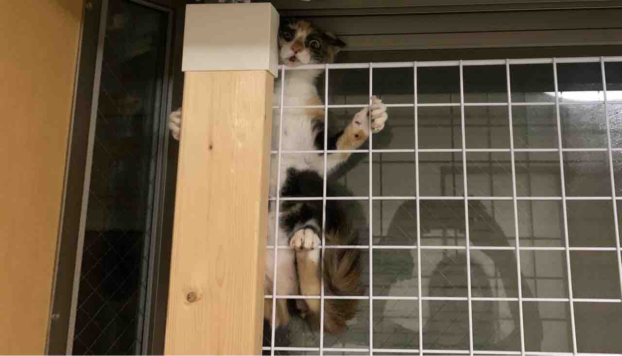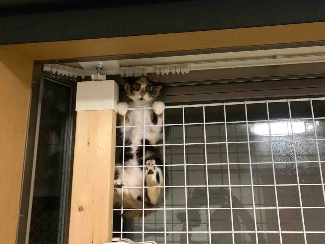 二階のリビングと寝室の窓にお父さんが設置してくれてる脱走防止網、まさかキャリコちゃんが隙間から入れるとは思いませんでした。