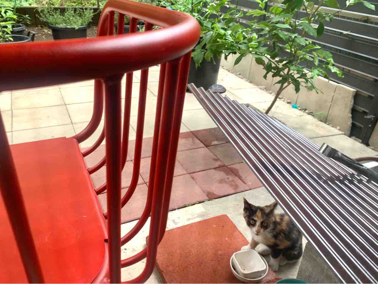 自分で登ったのに、降りられなくなってお母さんにウーーと鳴いてキレるキャリコちゃん。