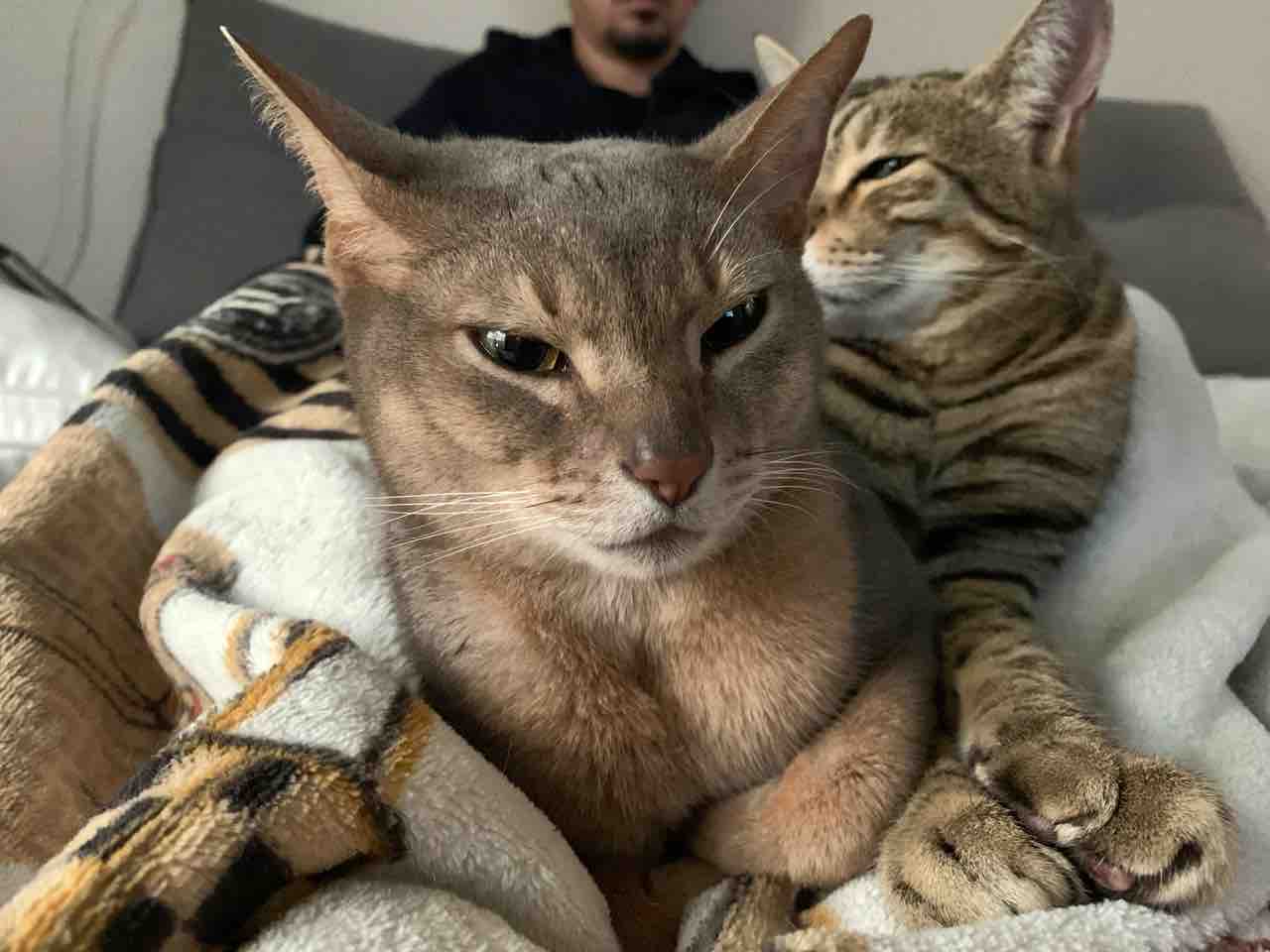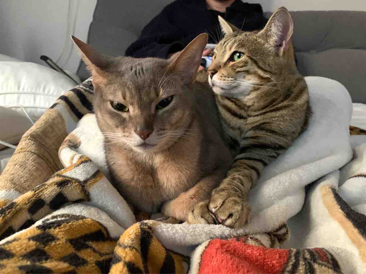 お父さんの足の上に乗ってるベネリ君とジャミちゃん。