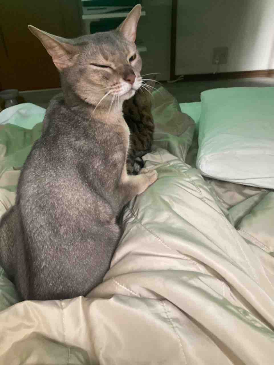 Benelli:僕の位置は、眩しくないんにゃよ。お父さんの足の先端に乗ると暗くて寝やすいにゃね。