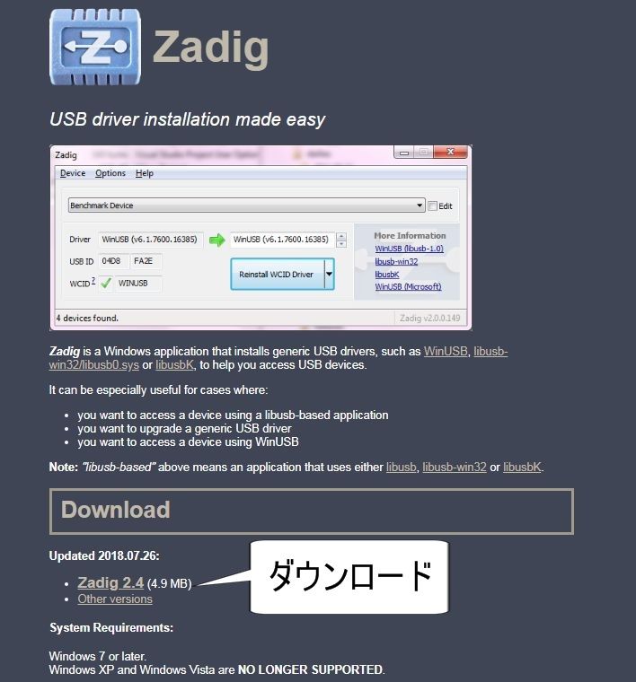 zadig v2.4は、実行ファイル形式でダウンロードされますので、解凍の必要がありませんのでそのまま起動できます。Win7以降用のみでWin XP用はサポートされていません、32bit/64bitの区別はありませんので付け加えます。