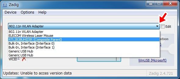 ・プルダウンでRTL2832Uまたは、RTL2838UHIDIRが表示されますので選択します。