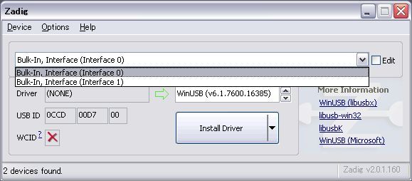 この↑場合は、一度ドライバーがインストールされています。再インストールになりますので、一度デデバイスマネージャでUniversal Seriial Busdevicesにドライバーが出ているか確認してください!再インストールは基本的に不要です。ワンセグTVのドライバーが一度インストールされた場合は、Reinstall DriverになりますのでBulk-In,Interface(Interface 0)を選択しインストールしましょう。
