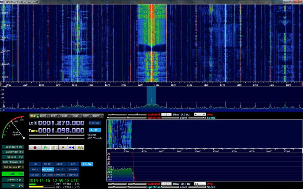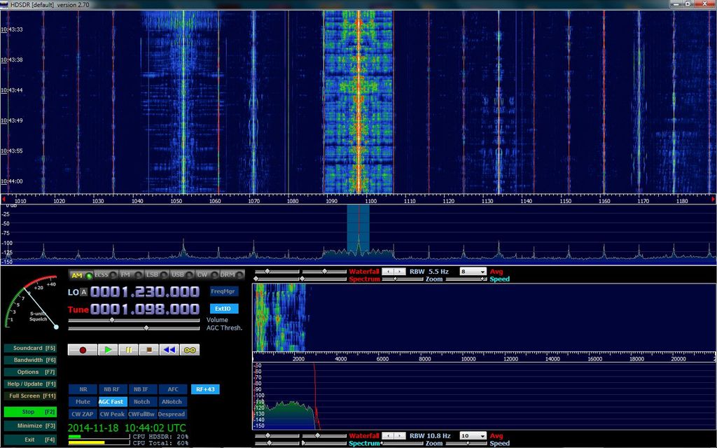 無改造チューナーでの受信・・・改造品よりゲインが低い感じ?改造チューナーの方がゲインが高い感じですよね・・・しかし・・・差があまり出ていないような?ウオーターフォールを見ると改造チューナーの方が感度が高いようです。無駄な信号は共にあまり見当たらないようです。あたりまえですゲイン絞ってますので・・・チューナーの個体差でしょうか?