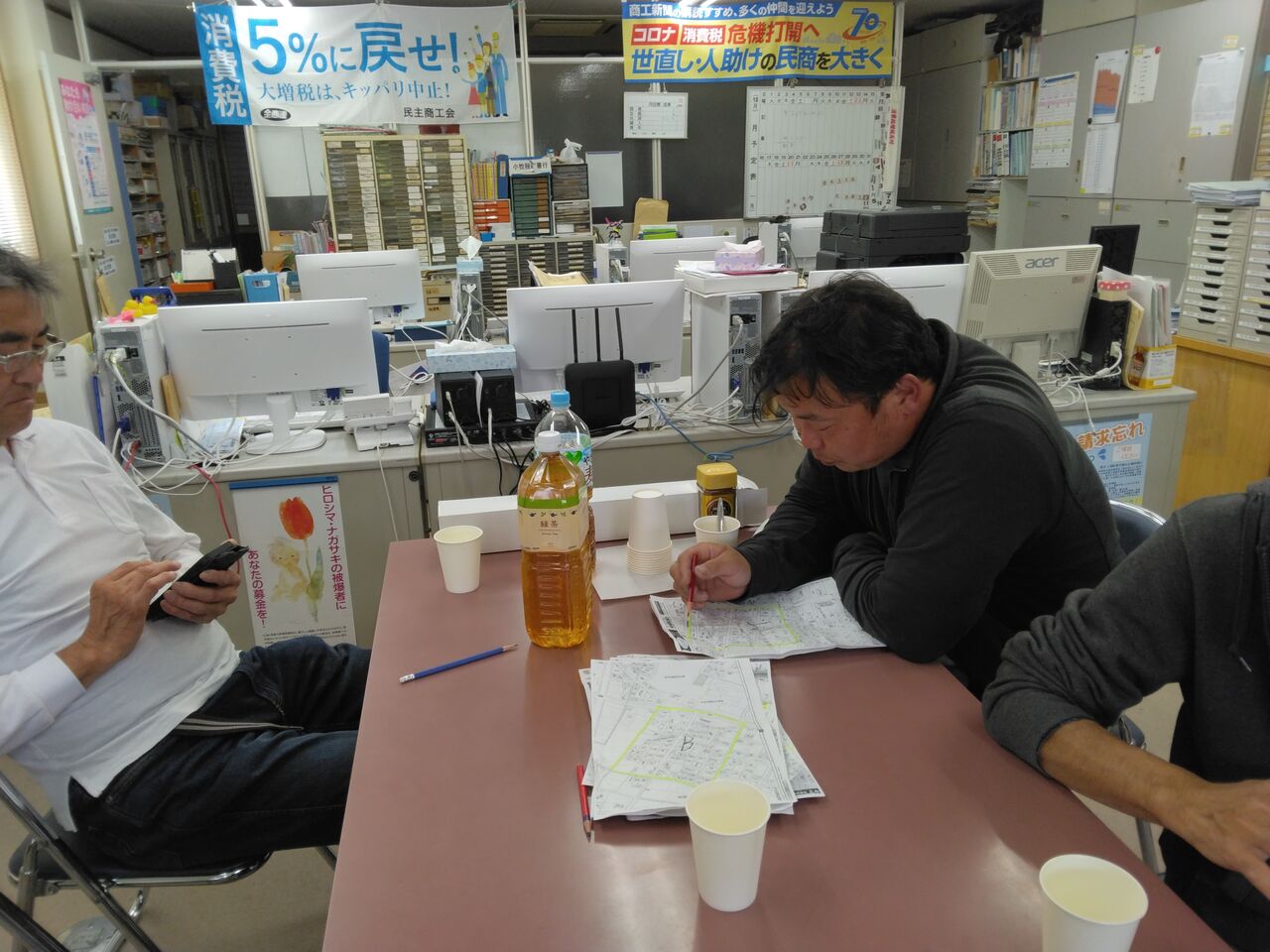 配布後は各参加者が飲物を片手に、今後の拡大運動のた め、配布をした地域で見つけた業者の情報を報告しました。 以前あったお店が閉 まっていたり、新し い業者が看板を出し ていたりと、移り変 わりの早さをあらた めて感じさせられま した。