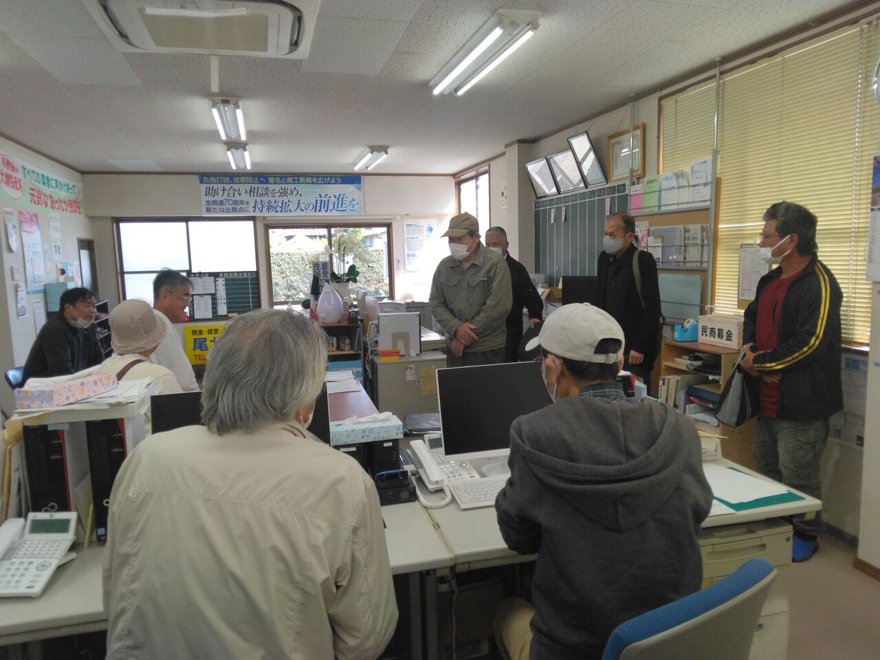 コロナ禍や申告計算活動のために休んでいた統一行動の 再開に、皆で意気高く取り組んで、新年度の拡大運動が動 き出しました。この日は共済会員を一人、新たに迎えるこ とができました。