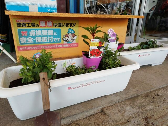 当店の正面玄関口の所に置いている、浅口商工会女性部の❬花💠いっぱい運動❭で植えた[ペチュニア*ギュギュ]が咲き始めました❗