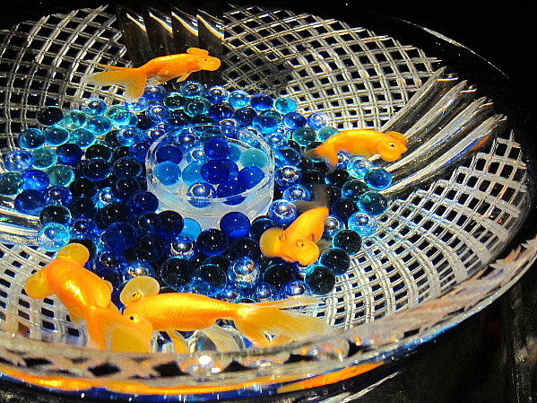 切子ガラスの器の中には、珍しい金魚