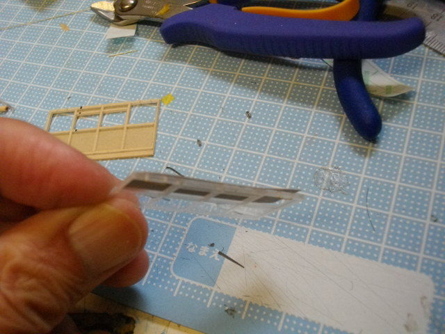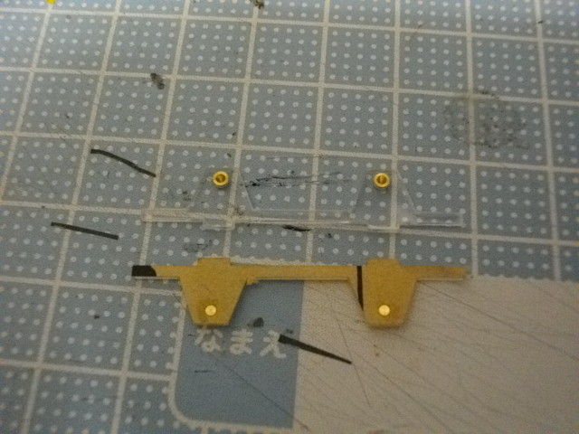 連結器を前後、台車枠の間に接着します。床板はさらに穴が空いていない0.5mmのものを床上に接着します。つまり床板は1.0mmの穴、筋ガイドがついているものと、0.5mm,の何も無いものを重ねて接着します。