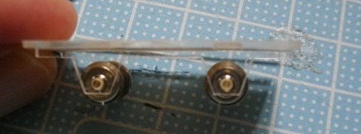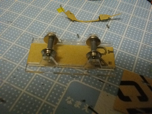 台車枠を床板(1mm)の穴を利用して接着します(アクリル専用接着剤)。最初少し接着剤を使用し、車輪をはめてみて、転がりを確認します。