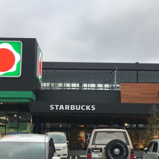 バングラディシュの国旗のようなマークがタイヨーの看板です。その横がスタバで奥に歩道を挟んで駅舎になります。ドライブスルー利用の車はスタバが入ったタイヨーの建物をぐるりと回る面白い遠回りさせる構造になっています。
