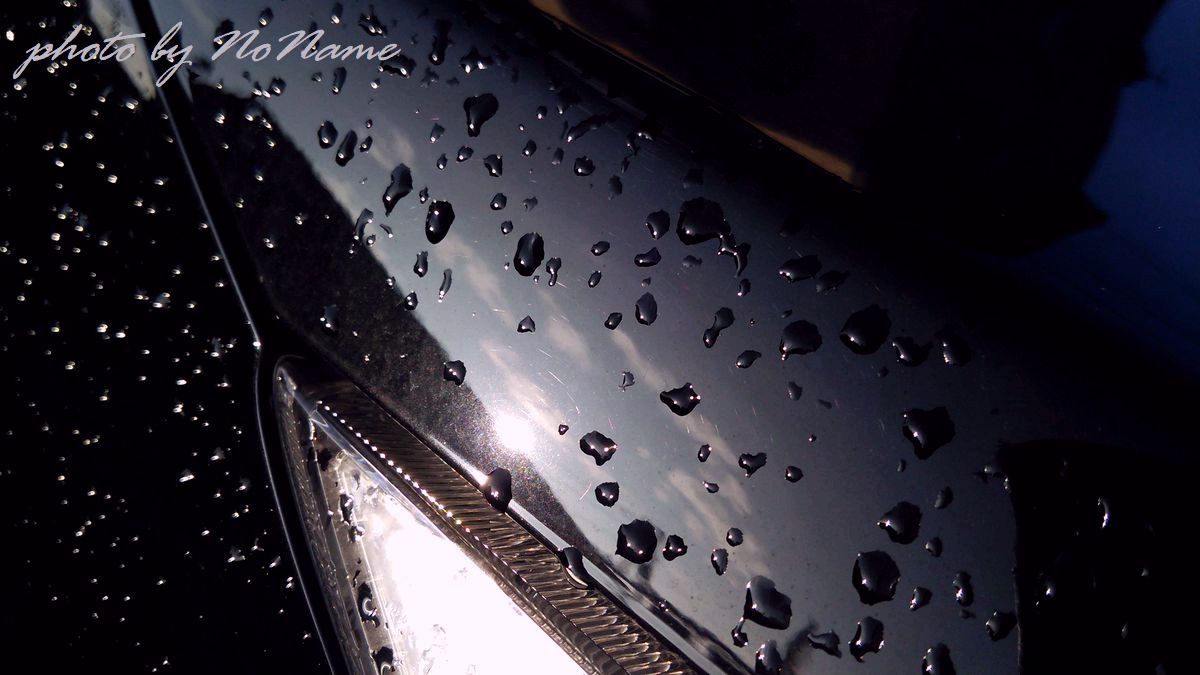 朝 5時半。 昨夜の雨粒が残る車のボンネット。