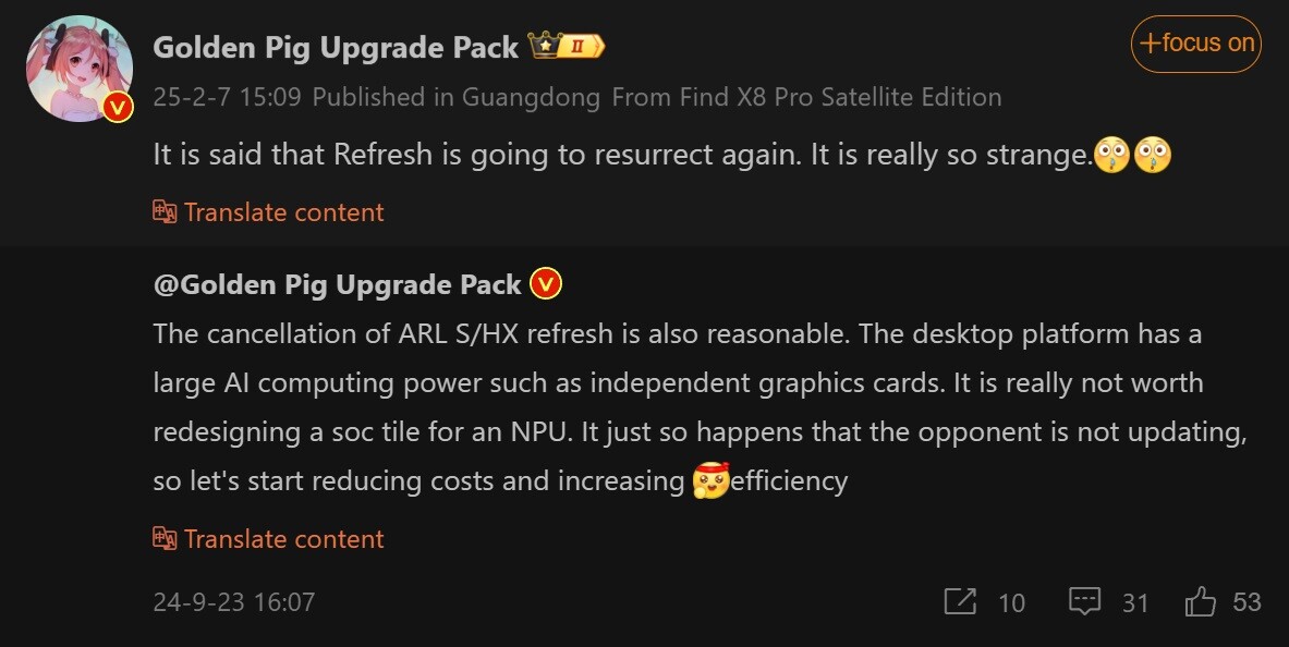 最初の噂は、インテルのArrow Lake Refresh CPUファミリーに関するGolden Pig Upgradeからのものだ。インテルArrow Lake Refresh CPUファミリーは当初、現行ラインナップのフォローアップとして計画され、Core Ultraシリーズ3チップの下にタグ付けされる予定だった。これらのチップは最新のNPUアーキテクチャを搭載する予定で、ダイサイズが大きくなり、既存のCore Ultraシリーズ2「Arrow Lake」チップの13TOPSに対して、より高いAI TOPSを提供することになる。