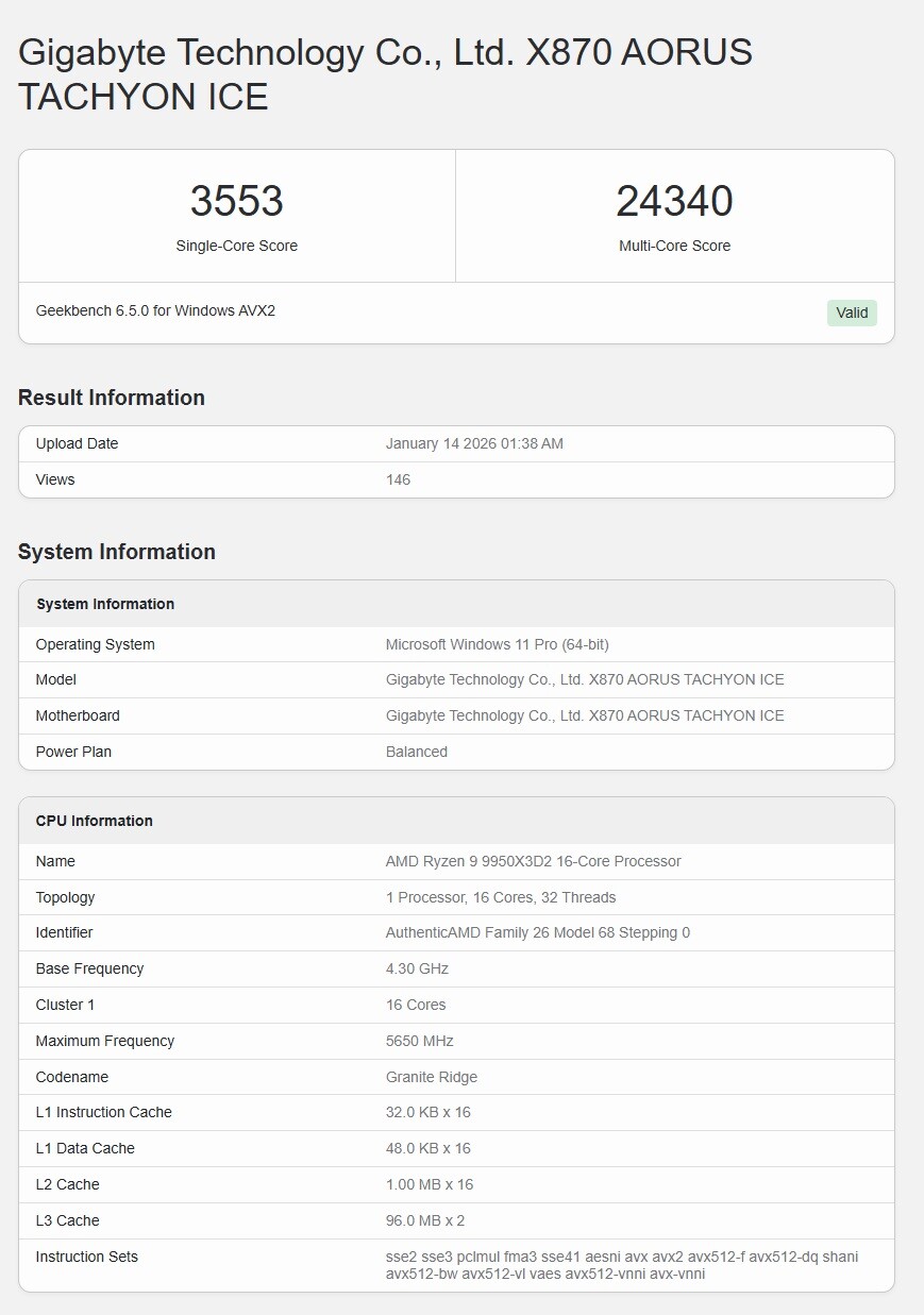 @9550proが発見したように、Ryzen 9 9950X3D2はGIGABYTE X870 AORUS Tachyon ICEマザーボードでベンチマークされ、前回とは異なり今回はスコアが大幅に上昇している。プロセッサはシングルコアテストで3,553ポイント、マルチコアテストで24,340ポイントを記録し、前回と比較してシングル/マルチスレッド性能が大幅に向上。Ryzen 9 9950X3Dを約7%上回る結果となった。