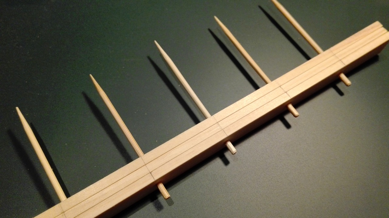 フレームに仮組み → 竹ひごを通して最終確認 → バラして一枚づつ接着 → ボンドが乾いたら竹ひごを通して完成