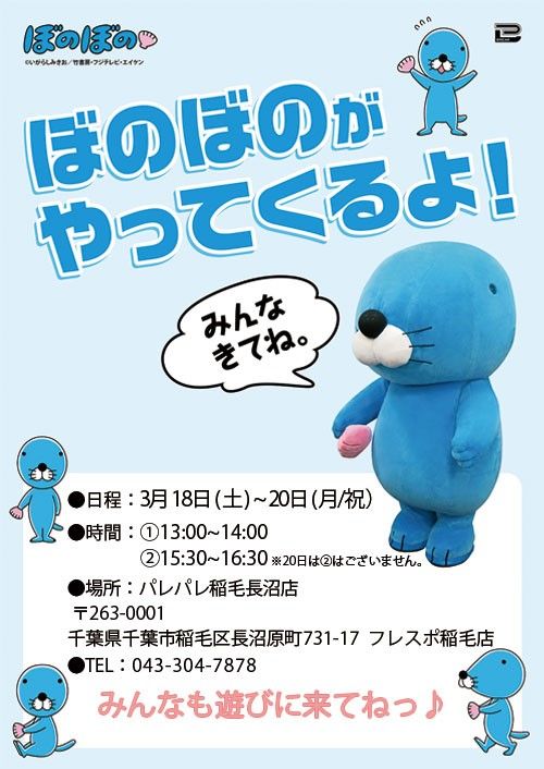 そして、3/25~4/10までキデイランド5店舗(原宿店・梅田店・吉祥寺店・越谷店・福岡パルコ店)にて、お披露目イベント『ぼのぼのフェア Bloom~ブルーム~』も開催決定!