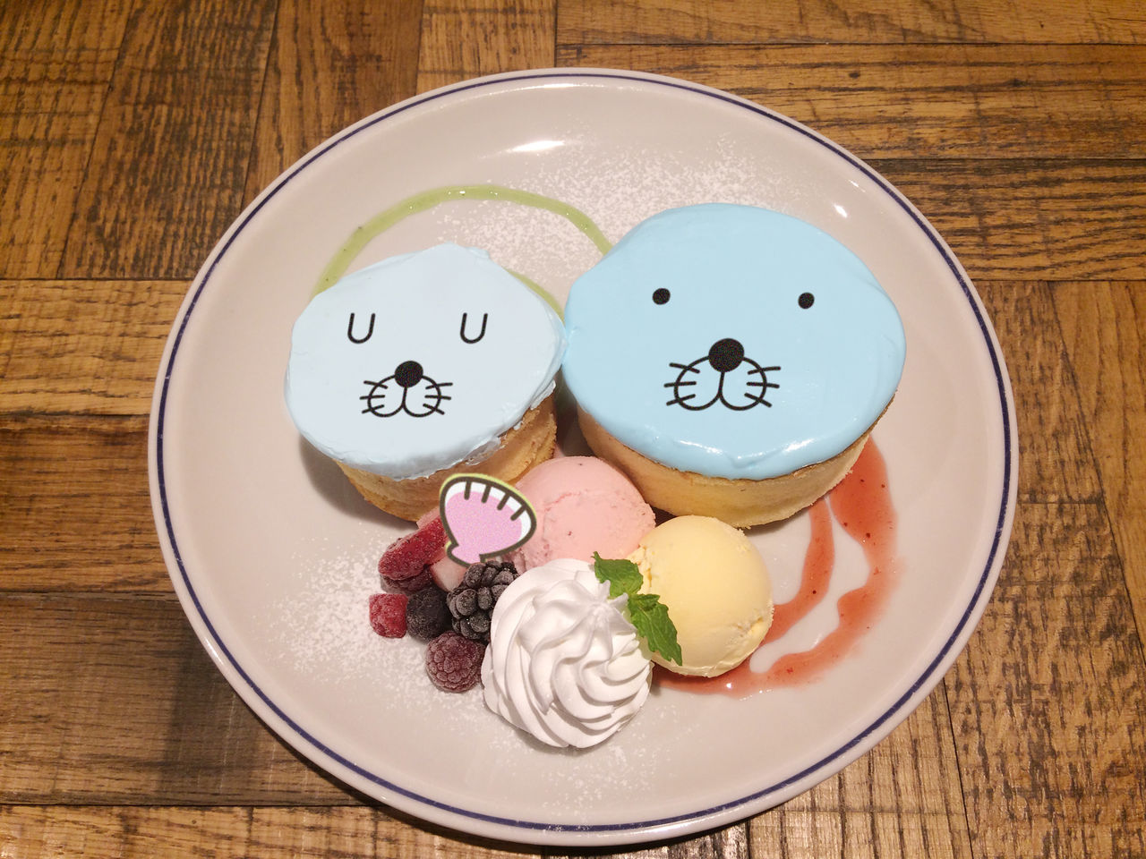ぼのぼのパンケーキに大き目サイズのおとうさんパンケーキがセットになった、シェアして食べられる親子プレート。