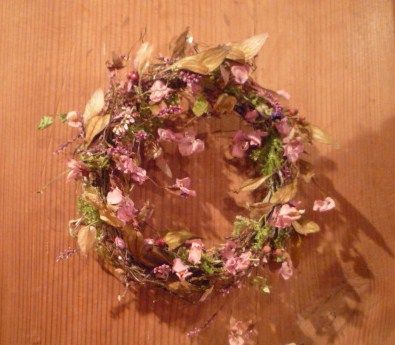これは、秋海棠のリース。淡いピンクの可愛らしい花と実が使われています。