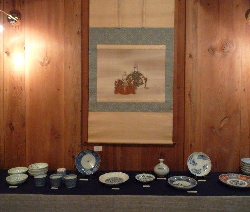 会場、正面。 藍柿右衛門の桜流水文皿など。