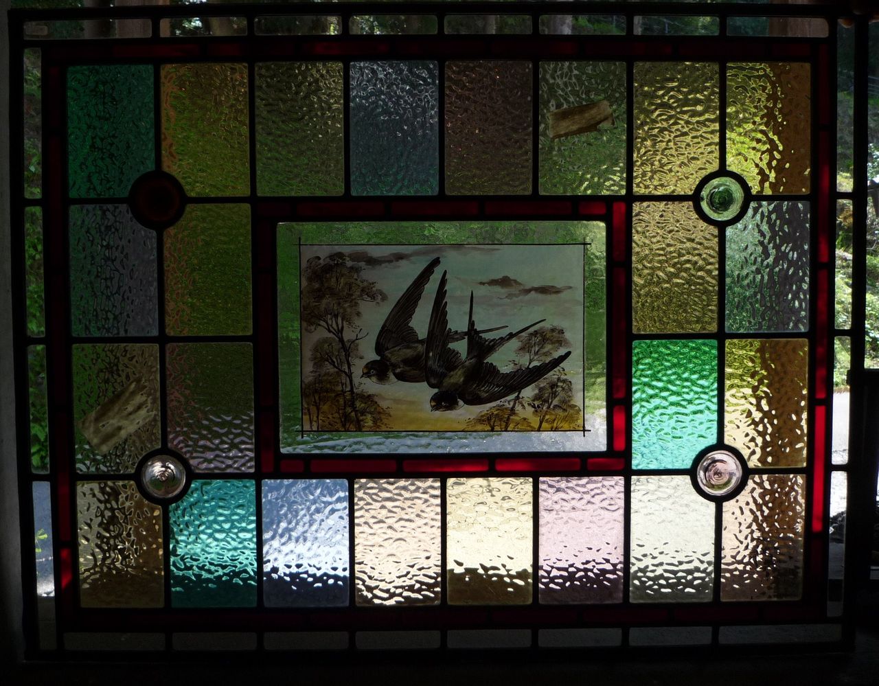 これは、中央部にガラス絵でツバメが描かれた古いステンドグラス。