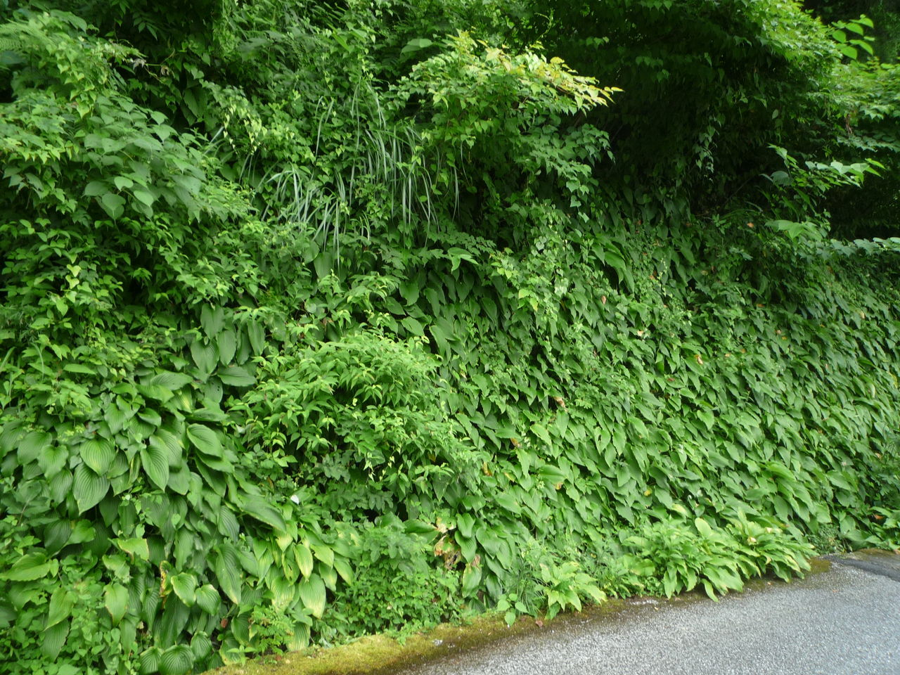 上部のイタドリが枝を長く伸ばし、それにヤマノイモなどのつるが絡んで