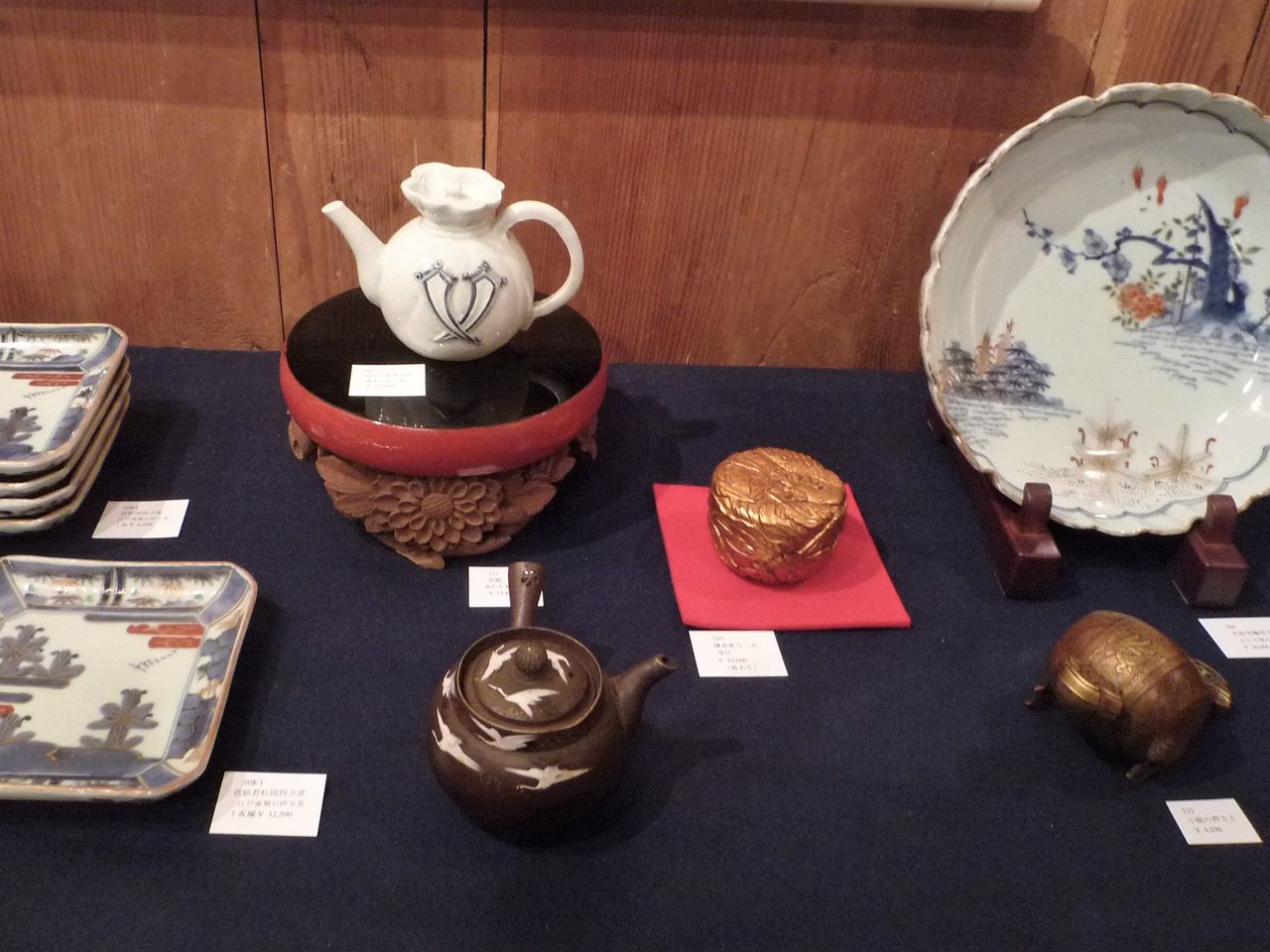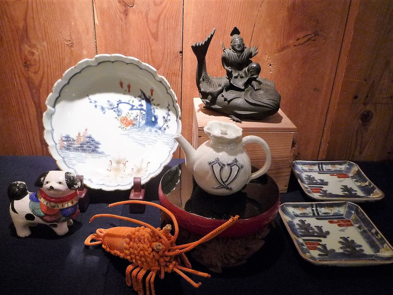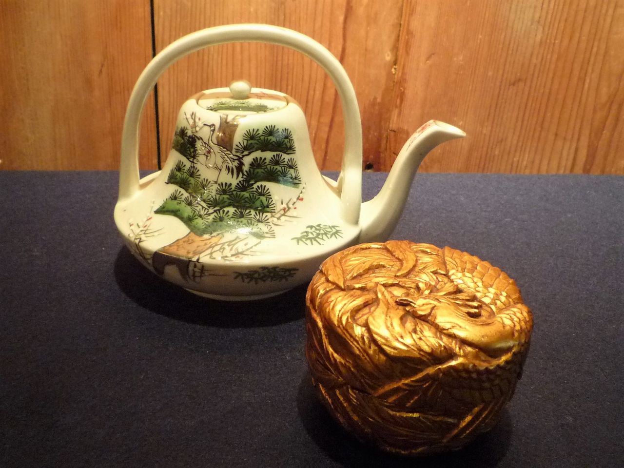 小さな宝袋型水注は幕末の平戸焼。それを載せた彫刻のある台は香盤。鎌倉彫りの金色の棗ほか。