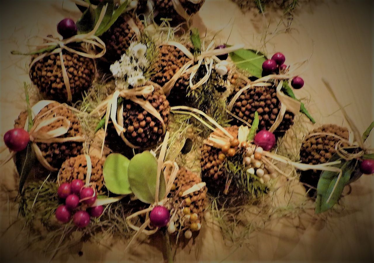 スワッグとはドア飾り。山や道端でとった木の実や野草で作った作品が