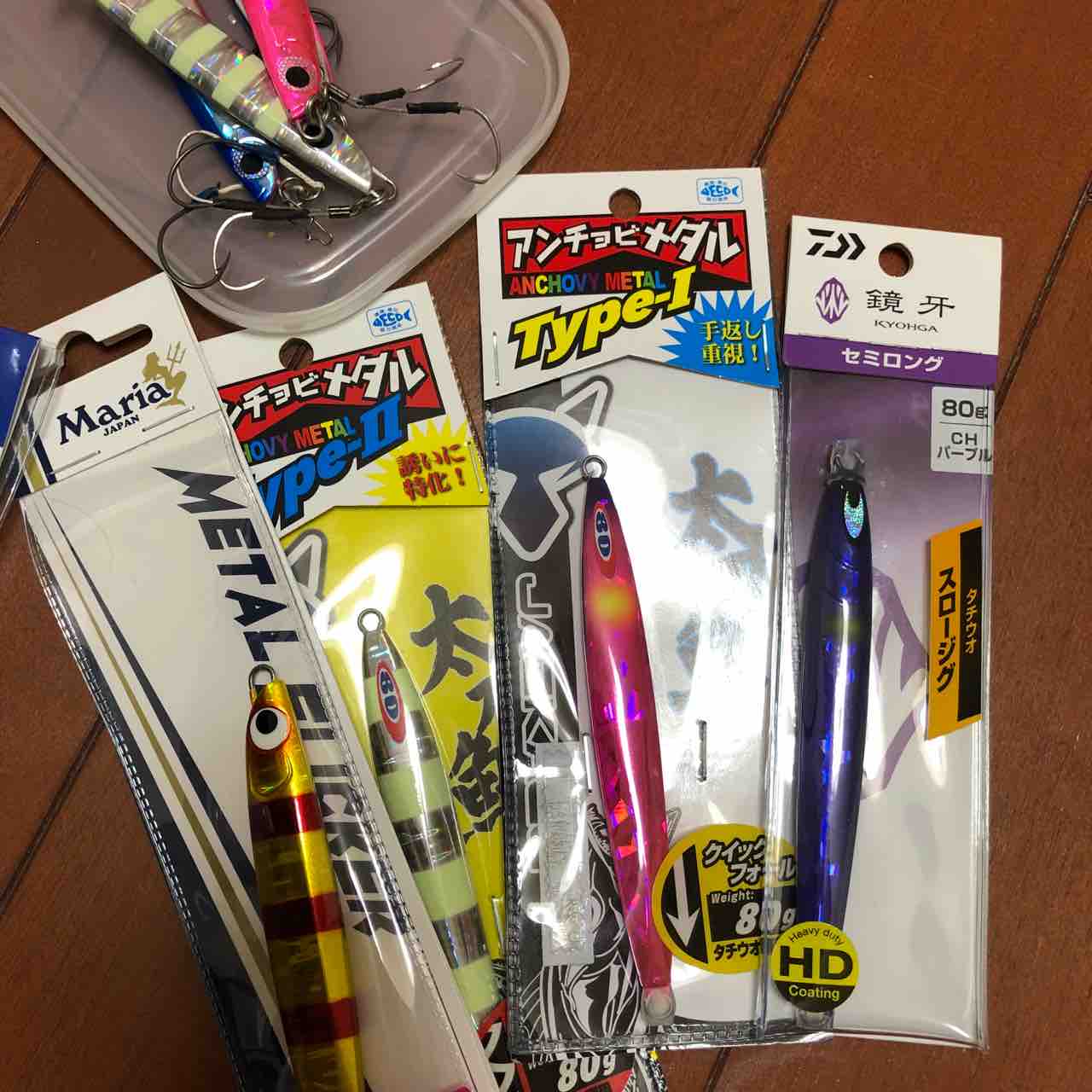 とのこと。水深が20m程度と浅いので、そんなに凝らなくても大丈夫みたい。ジグも40gでも大丈夫なようですが、手返しを考えると60~80gあった方がよい、とのこと。とりあえず80gを4色購入(60gはなぜか昨年買っていた)。案外安く、1個500~700円くらいで買えます。リアのフックはトレブルはST-46の#2を流用。フロントはさすがにワイヤ入りの専用アシストフックを買いましたが。オフショアにしては、なかなか手軽に始められる部類かと思います。