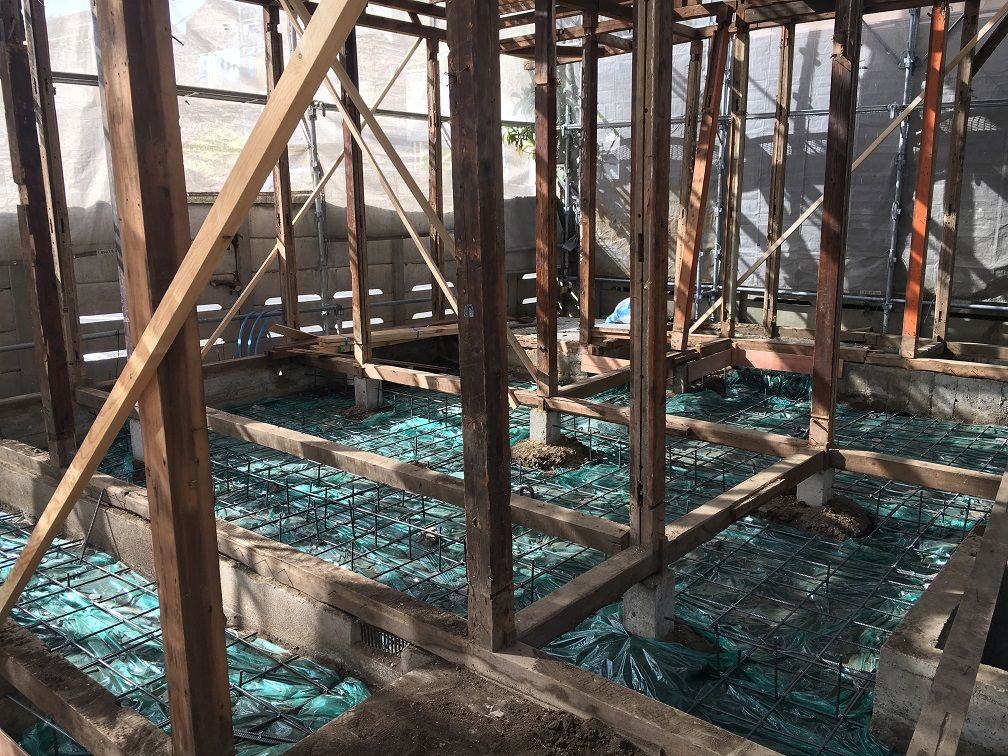 骨組みだけになった後、地面の上に配筋を施して、コンクリートを打設します。