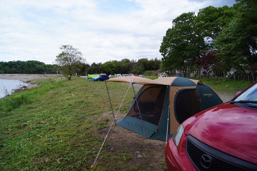 新緑のフィールド!そして小川キャンパルのテント群!前日入りの犬ばかさん登場!