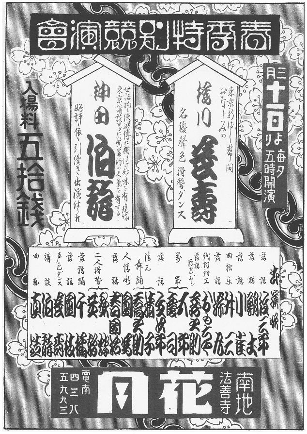 ◇[広告]浪花館/三月二十七日より東京落語橘家扇三一行/演題 浪花落語(喜久三)笑話踊(枝女蔵)落語手踊(橘家楽天坊)女道楽(歌沢芝美初)落語百種珍芸(桂三五郎)高級音曲萬歳(河内家春子、正春)ヴアイオリン義太夫各動物物真似(石村松雨)人情笑話一流踊(橘家扇三)大切余興(座員総出)