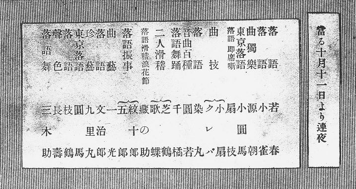 北新地花月倶楽部:「歌沢」寅小満、「落語」小さん、「小夜衣千太郎」常磐津文字花、「祐天吉松」伯山、「琵琶」錦心、「鳥屋の二階」左楽、「鳴戸」団司・小住、「明治政界秘史」痴遊、「木鼠吉五郎」孫三郎一座。