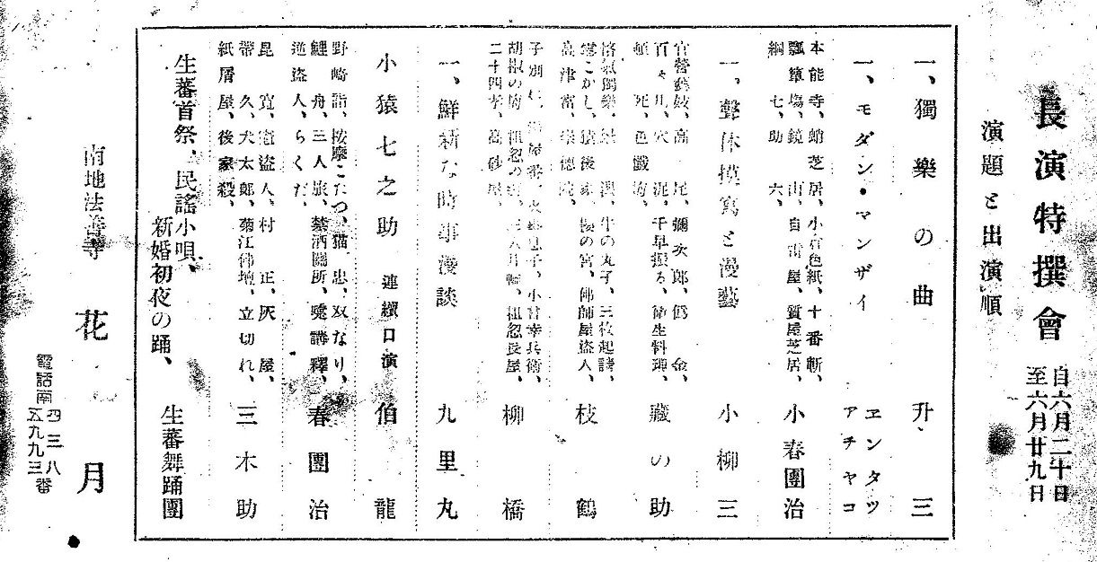 ◇西門松本座 琵琶(旭嬢)音曲(門三郎)落語(福松)芝居噺(花遊三)笑話(梅團冶)即席紙切(南天)落語(花橘)