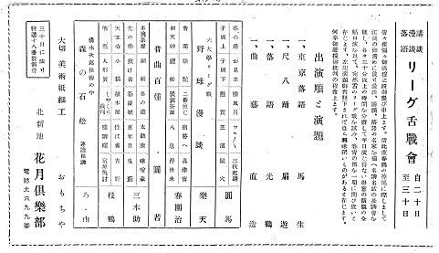 四月十八日、吉本興行部の了解と北村春歩君の厚意とによつて、会場を清水町の北むら三階大座敷で催す事にした。午後一時開会、四時閉会と触出したのは、夜間は出演者の職業上に支障を来たすのと、出演者の気分の上にもゆつくりしない。