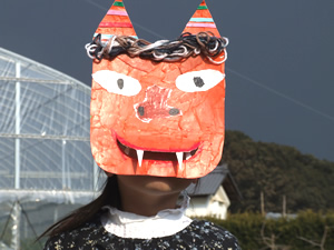 5歳の長女”うらら”が幼稚園で作った鬼のお面をかぶり