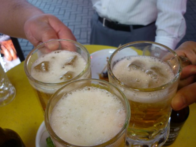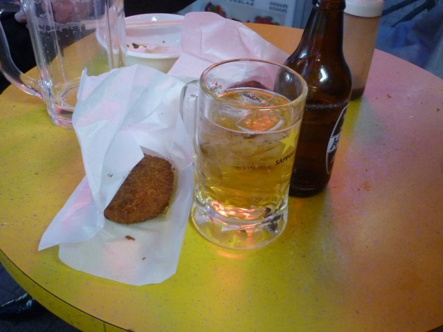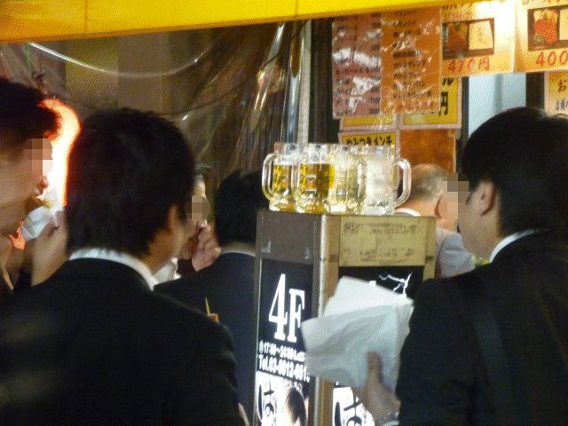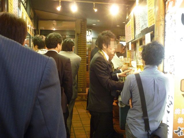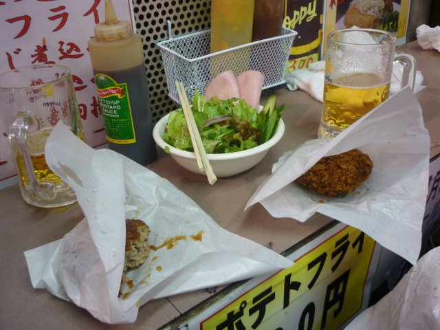 上野の「肉の大山」が、毎週月曜日に全アルコール半額セールをやっている、ということで、ブーさんどん七さんとで行ってきました。 どん七さんがちょっと遅れるということで、まずブーさんと二人でお店に到着。 凄い人出です。前のテーブルも、横のカウンターも一杯です。 それでも列に並んで、大生ビール@300円と特製メンチ@200円にハムサラダ@200円を注文しました。ところが大生はジョッキが戻ってきてないので、中生ビール@190円になってしまいました。 店の横のカウンターにかろうじて場所を確保。 でも皆さんちょっとお行儀悪いです。 大生ジョッキ置いたまま、他所に行ったり、超満員の立ち呑みカウンターで、書類を出して仕事の打ち合わせを延々とやったりしています。 そうこうしているうちに、どん七さん登場。 列に並んだどん七さんに、ホッピー@150円を買って貰って、再度乾杯。 揚げ物ジューシーで旨いですが、2個食べた人ら、もう限界です。 ボクは、メンチ1個とハムサラダにしていたので、お腹は楽でした。 店頭のテーブル席の前にも人が渦巻いてます。 団体で来て、テーブルが無いので、隣の店の宣伝の行灯にジョッキを置いているグループもあります(笑)。 学校の文化祭みたいで、楽しい雰囲気だと思って楽しむのがコツですね。 合計740円とセンベロ以下で、御徒町の次の店に向かいました。