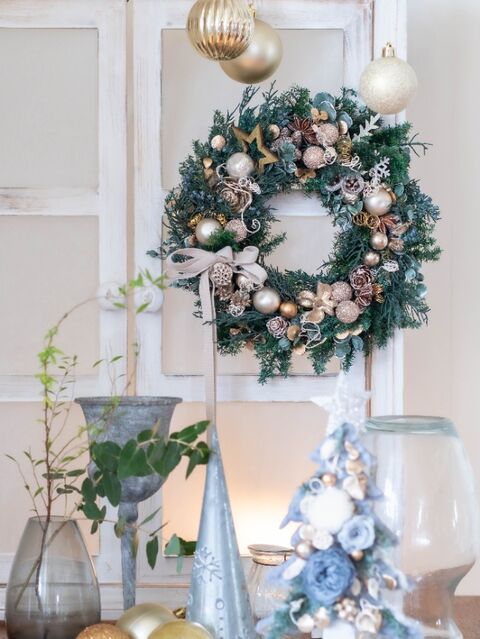 ライトグレーの自立するツリーに、プリザーブドフラワーやグリーンとクリスマスオーナメントを使って、飾り付けします。