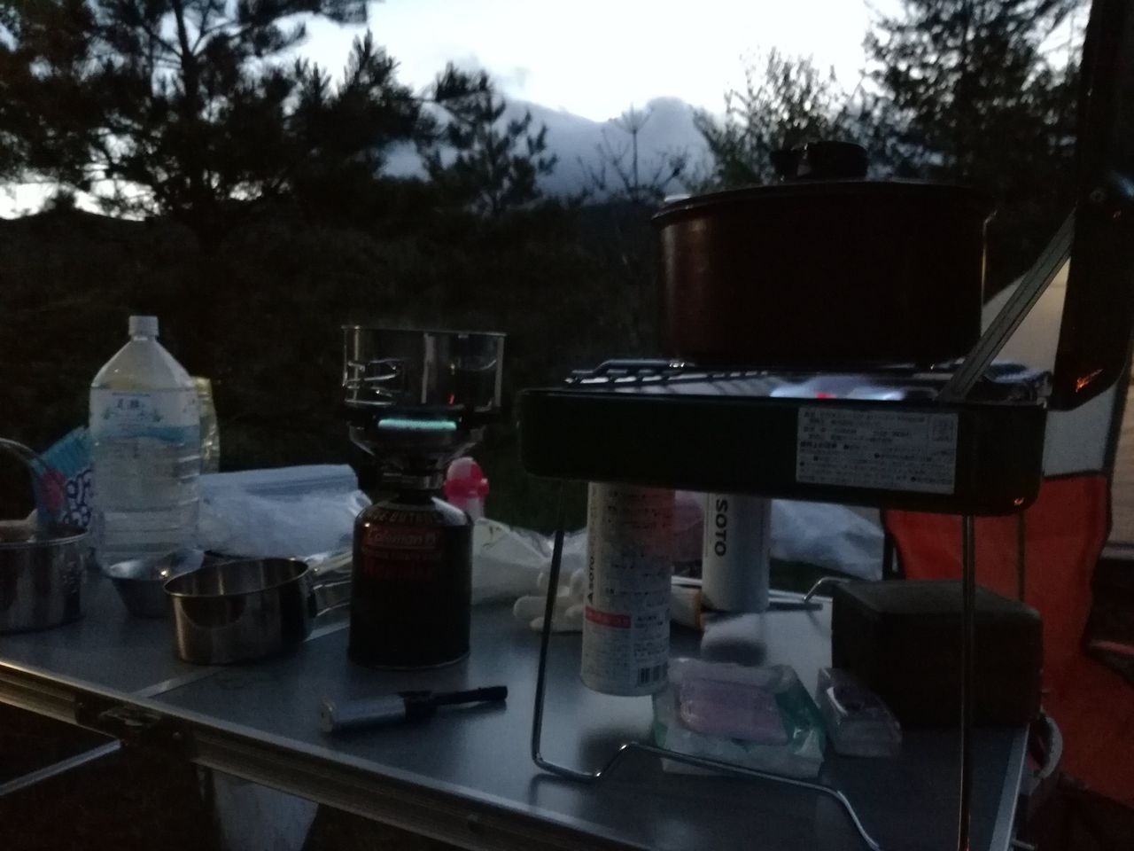 止む無く、鍋からコッヘルに小分けし、コールマンのガスストーブで一人分ずつ仕上げて食事。こちらもレギュラーガスだが、缶を加温する仕組みがあるのでだいぶ違う。
