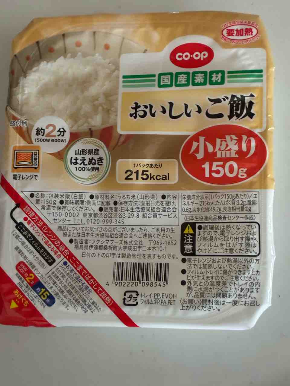 炊きあがりに63分かかるので、もう間に合わない朝ごはんのごはん、仕方なくレンジで2分の「おいしいご飯」小盛り150gを取り出しました。